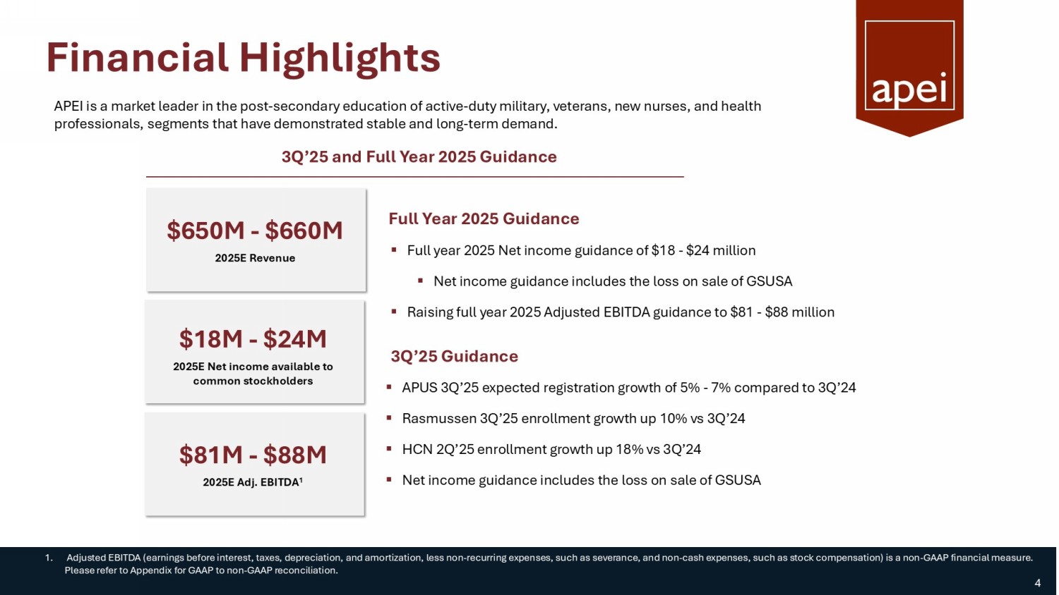| · | 2025年通年の売上高予想を6億5,000万ドルから6億6,000万ドルの間で再確認。2025年通年の普通株主に帰属する当期純利益のガイダンスを、USA大学院売却に伴う損失と優先株償還損を反映して1,800万ドルから2,400万ドルの範囲に再設定。2025年通年の調整後EBITDAガイダンスを8,100万ドルから8,800万ドルの範囲に引き上げる。 |