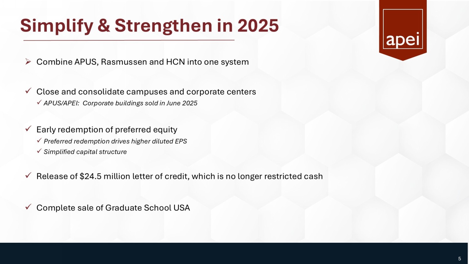 | · | APEIは2025年7月25日、米国大学院の売却を完了した。 |