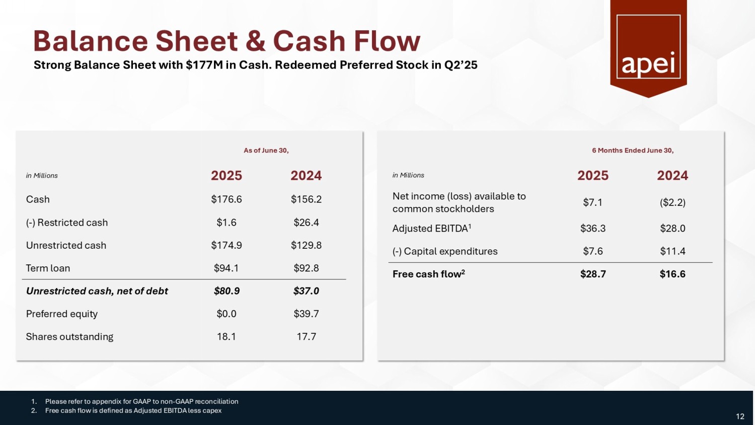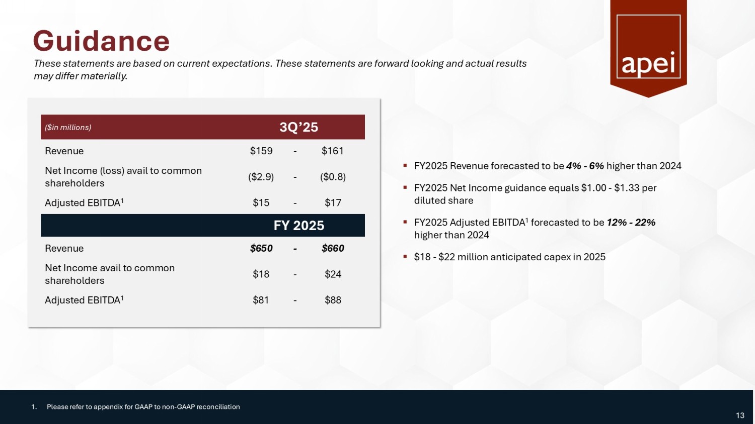 本プレスリリースには、非GAAPベースの財務指標であるEBITDA(金利・税金・減価償却費・償却前利益)および調整後EBITDA(EBITDAから株式報酬や臨時費用などの非現金支出費用を控除したもの)が含まれています。APEIは、これらの指標の使用は、投資家がAPEIの営業利益およびキャッシュ創出能力をより良く評価することを可能にするため、有用であると考えています。