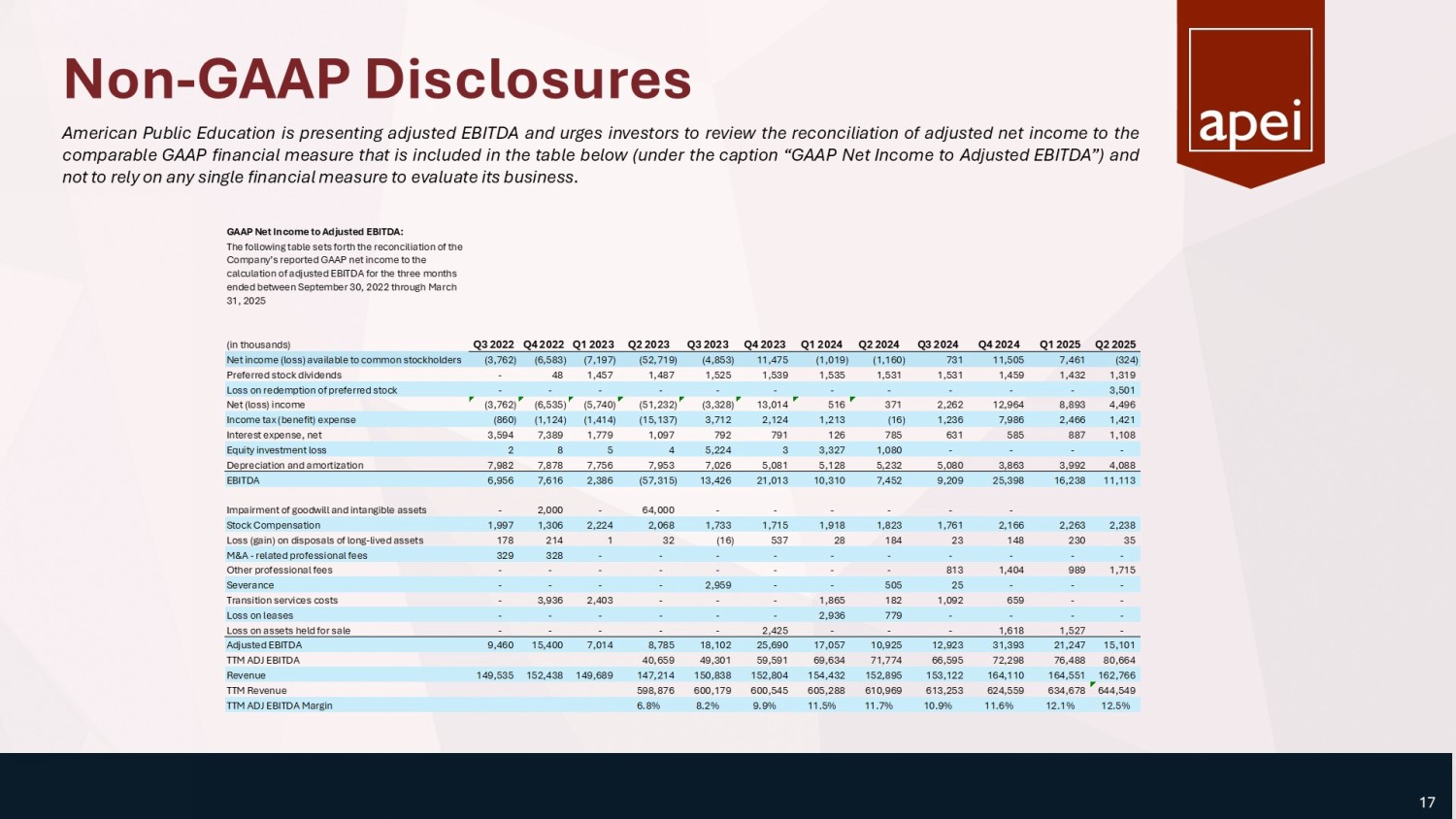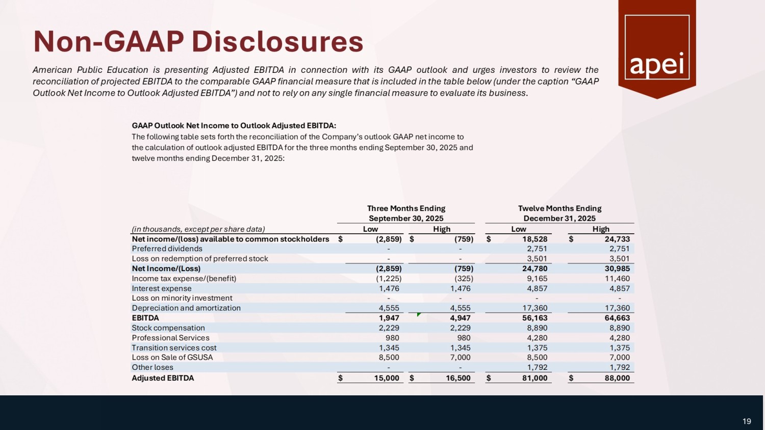 | APEI Adjusted EBITDA | $15.0 – $17.0 | 16% to 32% | ||