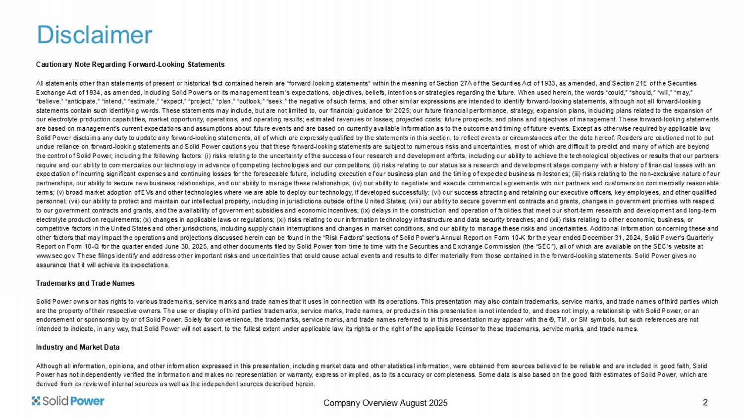 Cautionary Note Regarding Forward - Looking Statements All statements other than statements of present or historical fact contained herein are “forward - looking statements” within the meaning of Section 27A of the Securities Act of 1933, as amended, and Section 21E of the Securities Exchange Act of 1934, as amended, including Solid Power’s or its management team’s expectations, objectives, beliefs, intenti ons or strategies regarding the future. When used herein, the words “could,” “should,” “will,” “may,” “believe,” “anticipate,” “intend,” “estimate,” “expect,” “project,” “plan,” “outlook,” “seek,” the negative of such terms, an d o ther similar expressions are intended to identify forward - looking statements, although not all forward - looking statements contain such identifying words. These statements may include, but are not limited to, our financial guidance for 2 025 ; our future financial performance, strategy, expansion plans, including plans related to the expansion of our electrolyte production capabilities, market opportunity, operations, and operating results; estimated revenues or losses; pr ojected costs; future prospects; and plans and objectives of management. These forward - looking statements are based on management’s current expectations and assumptions about future events and are based on currently available infor mat ion as to the outcome and timing of future events. Except as otherwise required by applicable law, Solid Power disclaims any duty to update any forward - looking statements, all of which are expressly qualified by the statements in this section, to reflect events or circumstances after the date hereof. Readers are cautioned not to put undue reliance on forward - looking statements and Solid Power cautions you that these forward - looking statements are subject to n umerous risks and uncertainties, most of which are difficult to predict and many of which are beyond the control of Solid Power, including the following factors: ( i ) risks relating to the uncertainty of the success of our research and development efforts, including our ability to achieve the technological objectives or results that our partners require and our ability to commercialize our technology in advance of competing technologies and our competitors; (ii) risks rel ating to our status as a research and development stage company with a history of financial losses with an expectation of incurring significant expenses and continuing losses for the foreseeable future, including execution of our bu sin ess plan and the timing of expected business milestones; (iii) risks relating to the non - exclusive nature of our partnerships, our ability to secure new business relationships, and our ability to manage these relationships; (iv) our abili ty to negotiate and execute commercial agreements with our partners and customers on commercially reasonable terms; (v) broad market adoption of EVs and other technologies where we are able to deploy our technology, if developed succe ssf ully; (vi) our success attracting and retaining our executive officers, key employees, and other qualified personnel; (vii) our ability to protect and maintain our intellectual property, including in jurisdictions outside of the Uni ted States; (viii) our ability to secure government contracts and grants, changes in government priorities with respect to our government contracts and grants, and the availability of government subsidies and economic incentives; (ix) delays in the construction and operation of facilities that meet our short - term research and development and long - term electrolyte production requirements; (x) changes in applicable laws or regulations; (xi) risks relating to our information te chn ology infrastructure and data security breaches; and (xii) risks relating to other economic, business, or competitive factors in the United States and other jurisdictions, including supply chain interruptions and changes in market con ditions, and our ability to manage these risks and uncertainties. Additional information concerning these and other factors that may impact the operations and projections discussed herein can be found in the “Risk Factors” sections of Sol id Power’s Annual Report on Form 10 - K for the year ended December 31, 2024 , Solid Power's Quarterly Report on Form 10 - Q for the quarter ended June 30, 2025, and other documents filed by Solid Power from time to time with the Securities and Exchange Commission (the “SEC”), all of which ar e available on the SEC’s website at www.sec.gov. These filings identify and address other important risks and uncertainties that could cause actual events and re sul ts to differ materially from those contained in the forward - looking statements. Solid Power gives no assurance that it will achieve its expectations. Trademarks and Trade Names Solid Power owns or has rights to various trademarks, service marks and trade names that it uses in connection with its opera tio ns. This presentation may also contain trademarks, service marks, and trade names of third parties which are the property of their respective owners. The use or display of third parties’ trademarks, service marks, trade names, or pro ducts in this presentation is not intended to, and does not imply, a relationship with Solid Power, or an endorsement or sponsorship by or of Solid Power. Solely for convenience, the trademarks, service marks, and trade names refer red to in this presentation may appear with the ®, TM, or SM symbols, but such references are not intended to indicate, in any way, that Solid Power will not assert, to the fullest extent under applicable law, its rights or th e right of the applicable licensor to these trademarks, service marks, and trade names. Industry and Market Data Although all information, opinions, and other information expressed in this presentation, including market data and other sta 