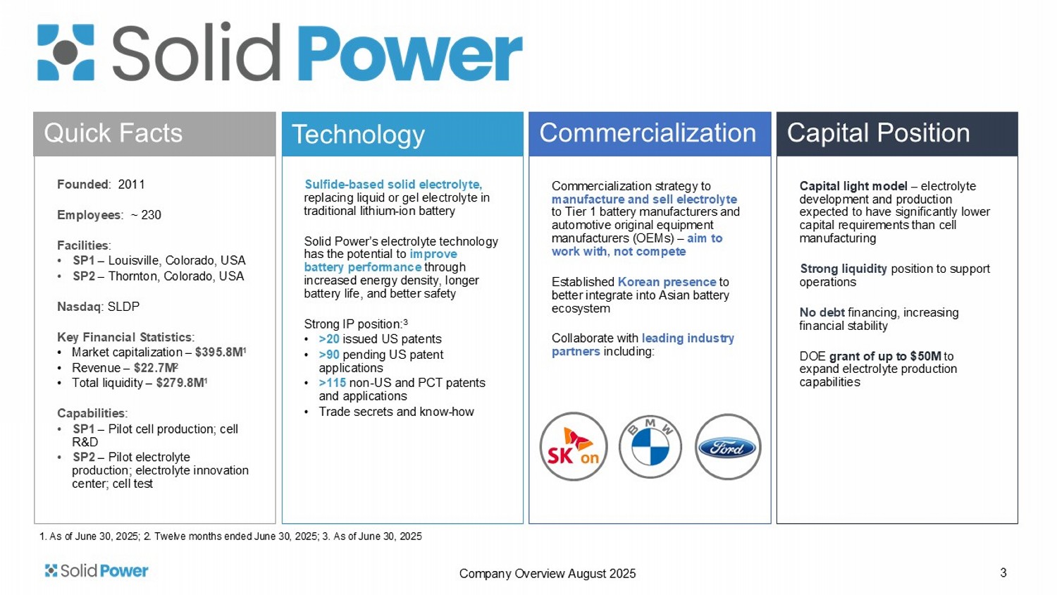 Disclaimer 2 Company Overview August 2025 Founded : 2011 Employees : ~ 230 Facilities : • SP1 – Louisville, Colorado, USA • SP2 – Thornton, Colorado, USA Nasdaq : SLDP Key Financial Statistics : • Market capitalization – $395.8M 1 • Revenue – $22.7M 2 • Total liquidity – $279.8M 1 Capabilities : • SP1 – Pilot cell production; cell R&D • SP2 – Pilot electrolyte production; electrolyte innovation center; cell test Quick Facts Commercialization strategy to manufacture and sell electrolyte to Tier 1 battery manufacturers and automotive original equipment manufacturers (OEMs) – aim to work with, not compete Established Korean presence to better integrate into Asian battery ecosystem Collaborate with leading industry partners including : Commercialization Sulfide - based solid electrolyte, replacing liquid or gel electrolyte in traditional lithium - ion battery Solid Power’s electrolyte technology has the potential to improve battery performance through increased energy density, longer battery life, and better safety Strong IP position: 3 • >20 issued US patents • >90 pending US patent applications • >115 non - US and PCT patents and applications • Trade secrets and know - how Technology Capital light model – electrolyte development and production expected to have significantly lower capital requirements than cell manufacturing Strong liquidity position to support operations No debt financing, increasing financial stability DOE grant of up to $50M to expand electrolyte production capabilities Capital Position 1. As of June 30, 2025; 2. Twelve months ended June 30, 2025; 3.