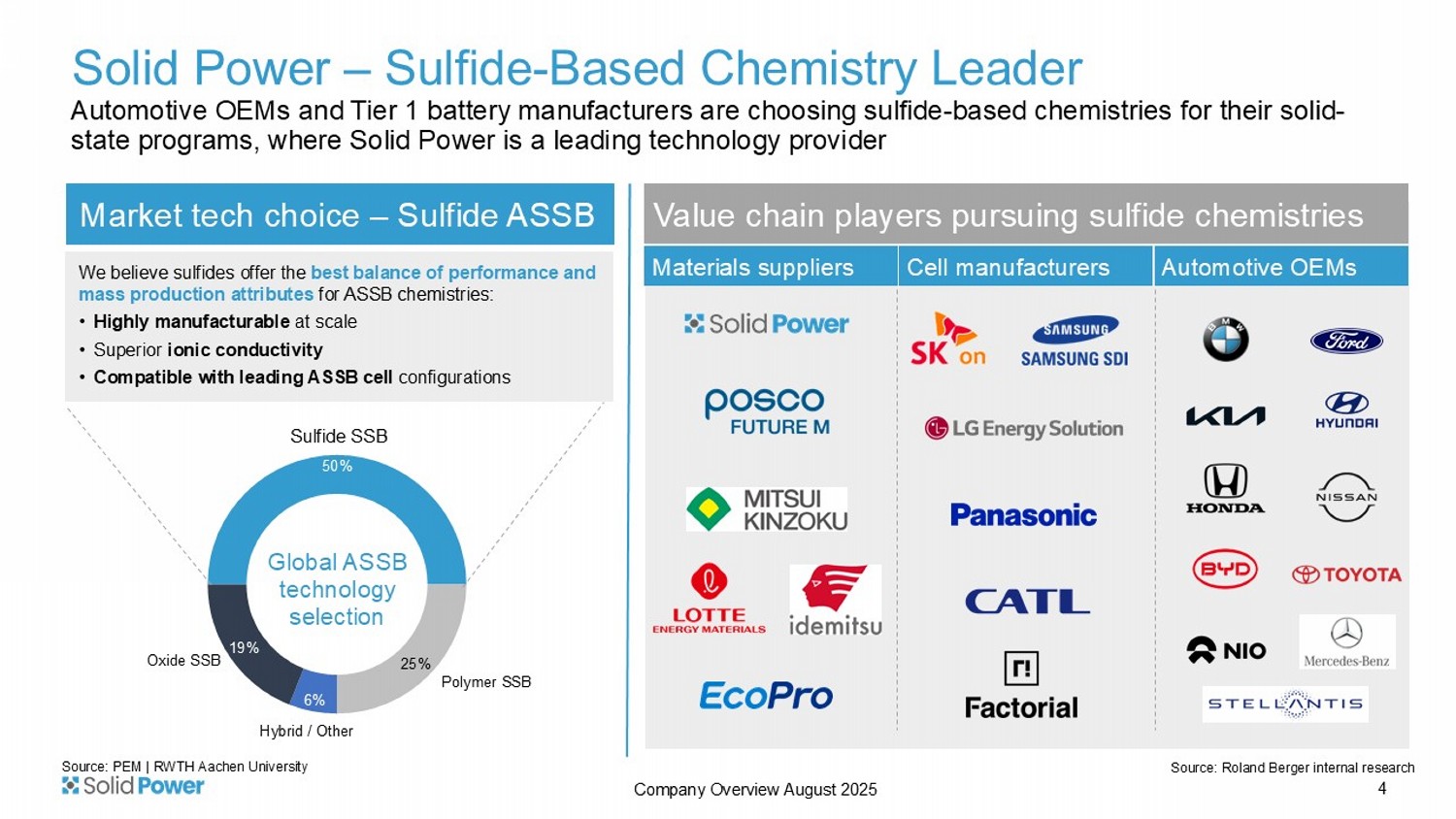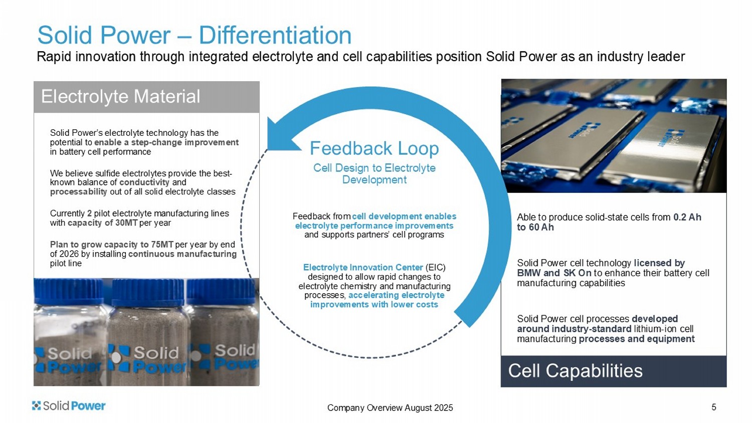 As of June 30, 2025 3 Company Overview August 2025 Solid Power – Sulfide - Based Chemistry Leader Materials suppliers Cell manufacturers Automotive OEMs Value chain players pursuing sulfide chemistries 50% 25% 6% 19% Sulfide SSB Polymer SSB Hybrid / Other Oxide SSB Global ASSB technology selection We believe sulfides offer the best balance of performance and mass production attributes for ASSB chemistries: • Highly manufacturable at scale • Superior ionic conductivity • Compatible with leading ASSB cell configurations Market tech choice – Sulfide ASSB Source: PEM | RWTH Aachen University 4 Automotive OEMs and Tier 1 battery manufacturers are choosing sulfide - based chemistries for their solid - state programs, where Solid Power is a leading technology provider Company Overview August 2025 Source: Roland Berger internal research Solid Power – Differentiation Solid Power’s electrolyte technology has the potential to enable a step - change improvement in battery cell performance We believe sulfide electrolytes provide the best - known balance of conductivity and processability out of all solid electrolyte classes Currently 2 pilot electrolyte manufacturing lines with capacity of 30MT per year Plan to grow capacity to 75MT per year by end of 2026 by installing continuous manufacturing pilot line Electrolyte Material Feedback Loop Cell Design to Electrolyte Development Feedback from cell development enables electrolyte performance improvements and supports partners’ cell programs Electrolyte Innovation Center (EIC) designed to allow rapid changes to electrolyte chemistry and manufacturing processes, accelerating electrolyte improvements with lower costs Able to produce solid - state cells from 0.2 Ah to 60 Ah Solid Power cell technology licensed by BMW and SK On to enhance their battery cell manufacturing capabilities Solid Power cell processes developed around industry - standard lithium - ion cell manufacturing processes and equipment Cell Capabilities Rapid innovation through integrated electrolyte and cell capabilities position Solid Power as an industry leader 5 Company Overview August 2025 Solid Power – Executive and Senior Leadership Team Deep technical, chemistry, engineering, supply chain, and public company experience 6 LINDA HELLER Chief Financial Officer, Treasurer, and Secretary • 25+ years of financial leadership experience • Broad public company experience across multiple industries BERISLAV BLIZANAC, PH.D.