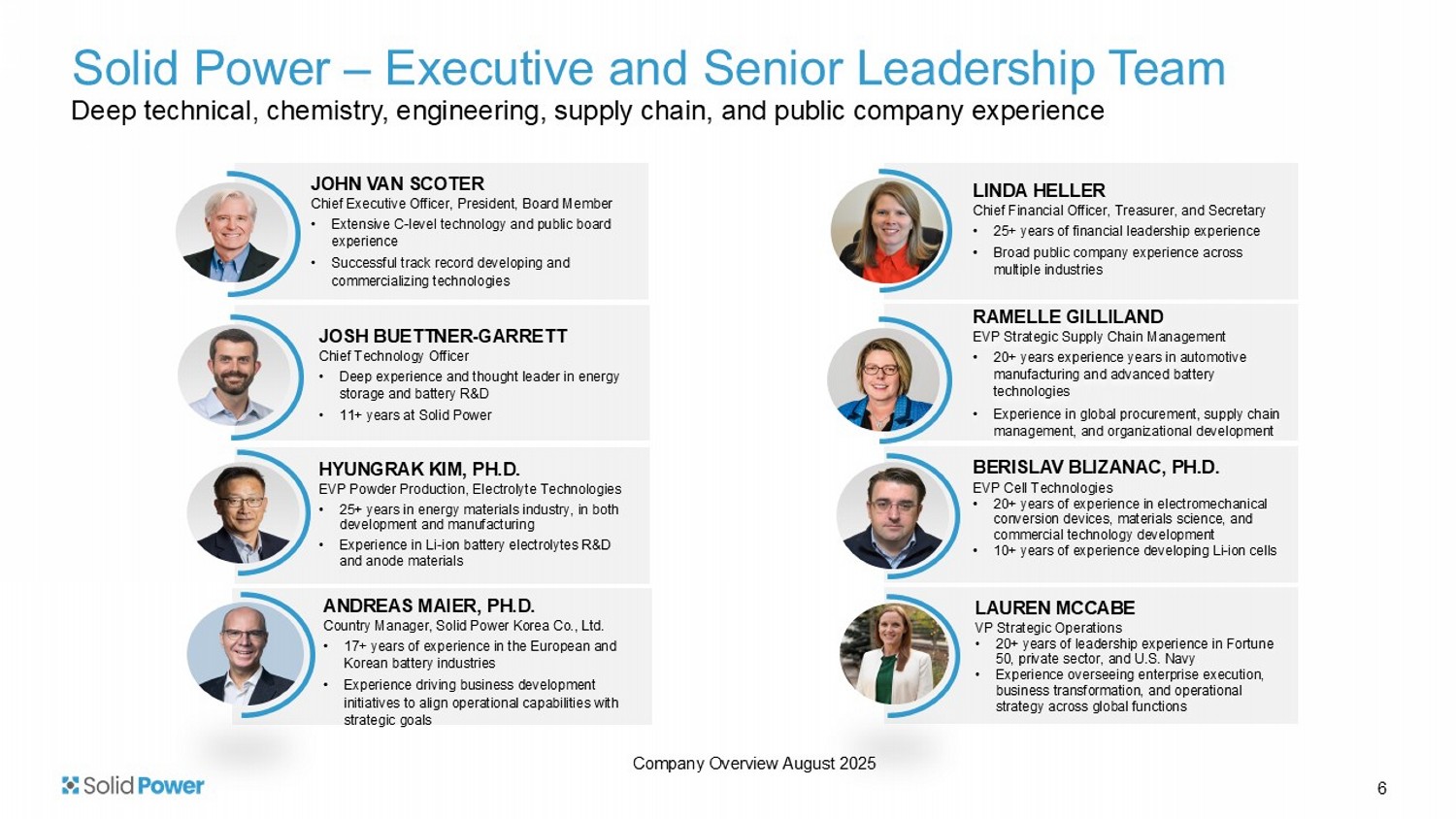 EVP Cell Technologies • 20+ years of experience in electromechanical conversion devices, materials science, and commercial technology development • 10+ years of experience developing Li - ion cells JOHN VAN SCOTER Chief Executive Officer, President, Board Member • Extensive C - level technology and public board experience • Successful track record developing and commercializing technologies HYUNGRAK KIM, PH.D. EVP Powder Production, Electrolyte Technologies • 25+ years in energy materials industry, in both development and manufacturing • Experience in Li - ion battery electrolytes R&D and anode materials JOSH BUETTNER - GARRETT Chief Technology Officer • Deep experience and thought leader in energy storage and battery R&D • 11+ years at Solid Power RAMELLE GILLILAND EVP Strategic Supply Chain Management • 20+ years experience years in automotive manufacturing and advanced battery technologies • Experience in global procurement, supply chain management, and organizational development Company Overview August 2025 ANDREAS MAIER, PH.D. Country Manager, Solid Power Korea Co., Ltd. • 17+ years of experience in the European and Korean battery industries • Experience driving business development initiatives to align operational capabilities with strategic goals LAUREN MCCABE VP Strategic Operations • 20+ years of leadership experience in Fortune 50, private sector, and U.S. Navy • Experience overseeing enterprise execution, business transformation, and operational strategy across global functions