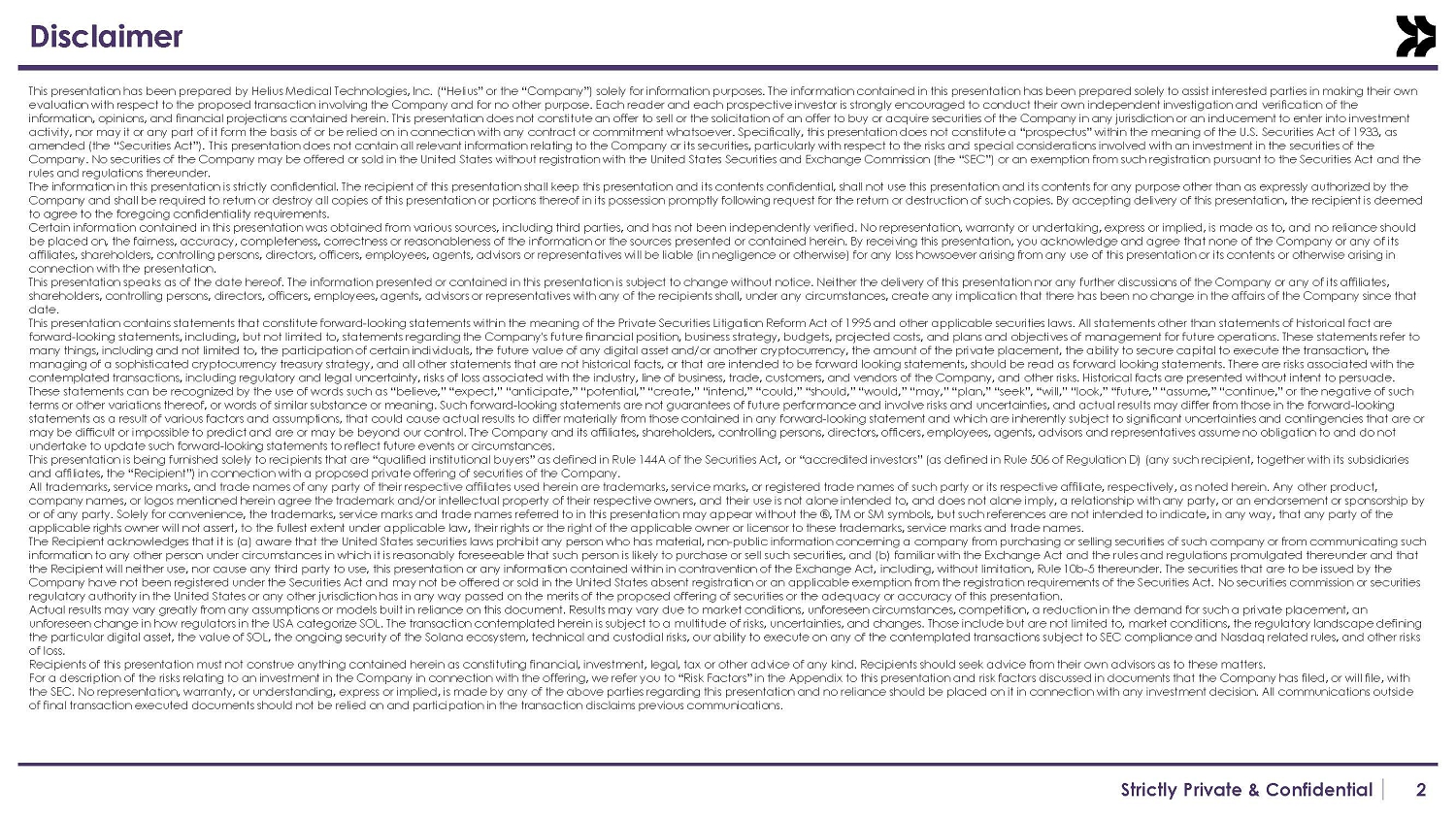 2 Strictly Private & Confidential Disclaimer This presentation has been prepared by Helius Medical Technologies, Inc. (“Helius” or the “Company”) solely for information p urp oses. The information contained in this presentation has been prepared solely to assist interested parties in making their ow n evaluation with respect to the proposed transaction involving the Company and for no other purpose. Each reader and each pros pec tive investor is strongly encouraged to conduct their own independent investigation and verification of the information, opinions, and financial projections contained herein. This presentation does not constitute an offer to sell or the solicitation of an offer to buy or acquire securities of the Company in any jurisdiction or an inducement to enter into inves tm ent activity, nor may it or any part of it form the basis of or be relied on in connection with any contract or commitment whatso eve r. Specifically, this presentation does not constitute a “prospectus” within the meaning of the U.S. Securities Act of 1933, as amended (the “Securities Act”). This presentation does not contain all relevant information relating to the Company or its se cur ities, particularly with respect to the risks and special considerations involved with an investment in the securities of the Company. No securities of the Company may be offered or sold in the United States without registration with the United States Se curities and Exchange Commission (the “SEC”) or an exemption from such registration pursuant to the Securities Act and the rules and regulations thereunder. The information in this presentation is strictly confidential. The recipient of this presentation shall keep this presentatio n a nd its contents confidential, shall not use this presentation and its contents for any purpose other than as expressly author ize d by the Company and shall be required to return or destroy all copies of this presentation or portions thereof in its possession prom ptl y following request for the return or destruction of such copies. By accepting delivery of this presentation, the recipient i s d eemed to agree to the foregoing confidentiality requirements. Certain information contained in this presentation was obtained from various sources, including third parties, and has not be en independently verified. No representation, warranty or undertaking, express or implied, is made as to, and no reliance should be placed on, the fairness, accuracy, completeness, correctness or reasonableness of the information or the sources presented or contained herein. By receiving this presentation, you acknowledge and agree that none of the Company or any of its affiliates, shareholders, controlling persons, directors, officers, employees, agents, advisors or representatives will be li abl e (in negligence or otherwise) for any loss howsoever arising from any use of this presentation or its contents or otherwise ari sing in connection with the presentation. This presentation speaks as of the date hereof. The information presented or contained in this presentation is subject to cha nge without notice. Neither the delivery of this presentation nor any further discussions of the Company or any of its affiliates , shareholders, controlling persons, directors, officers, employees, agents, advisors or representatives with any of the recipi ent s shall, under any circumstances, create any implication that there has been no change in the affairs of the Company since th at date. This presentation contains statements that constitute forward - looking statements within the meaning of the Private Securities Li tigation Reform Act of 1995 and other applicable securities laws. All statements other than statements of historical fact are forward - looking statements, including, but not limited to, statements regarding the Company's future financial position, busines s strategy, budgets, projected costs, and plans and objectives of management for future operations. These statements refer to many things, including and not limited to, the participation of certain individuals, the future value of any digital asset an d/o r another cryptocurrency, the amount of the private placement, the ability to secure capital to execute the transaction, the managing of a sophisticated cryptocurrency treasury strategy, and all other statements that are not historical facts, or that ar e intended to be forward looking statements, should be read as forward looking statements. There are risks associated with th e contemplated transactions, including regulatory and legal uncertainty, risks of loss associated with the industry, line of bu sin ess, trade, customers, and vendors of the Company, and other risks. Historical facts are presented without intent to persuade . These statements can be recognized by the use of words such as “believe,” “expect,” “anticipate,” “potential,” “create,” “int end ,” “could,” “should,” “would,” “may,” “plan,” “seek”, “will,” “look,” “future,” “assume,” “continue,” or the negative of such terms or other variations thereof, or words of similar substance or meaning. Such forward - looking statements are not guarantees of future performance and involve risks and uncertainties, and actual results may differ from those in the forward - looking statements as a result of various factors and assumptions, that could cause actual results to differ materially from those co nta ined in any forward - looking statement and which are inherently subject to significant uncertainties and contingencies that are o r may be difficult or impossible to predict and are or may be beyond our control. The Company and its affiliates, shareholders, co ntrolling persons, directors, officers, employees, agents, advisors and representatives assume no obligation to and do not undertake to update such forward - looking statements to reflect future events or cir