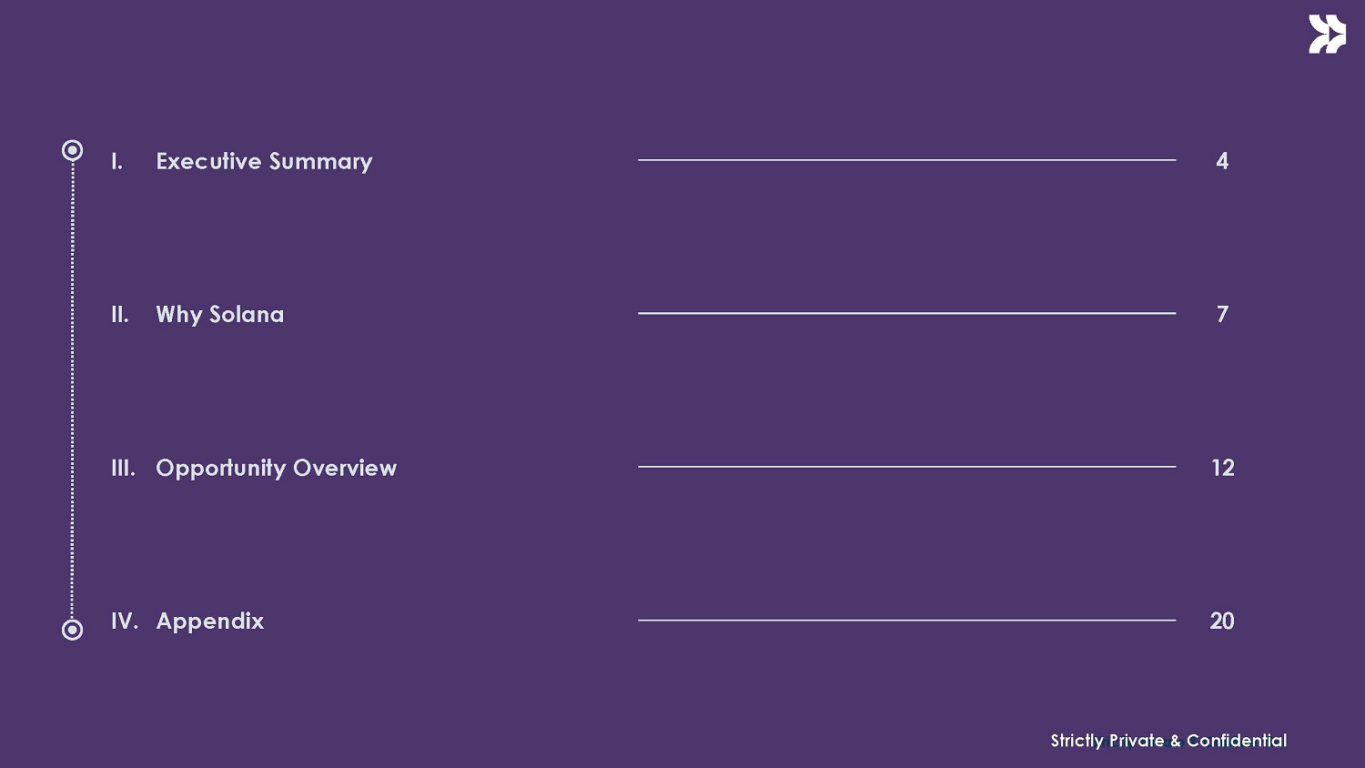 Strictly Private & Confidential Strictly Private & Confidential II. Why Solana 7 I. Executive Summary 4 IV. Appendix 20 III. Opportunity Overview 12 Strictly Private & Confidential Strictly Private & Confidential I. Executive Summary
