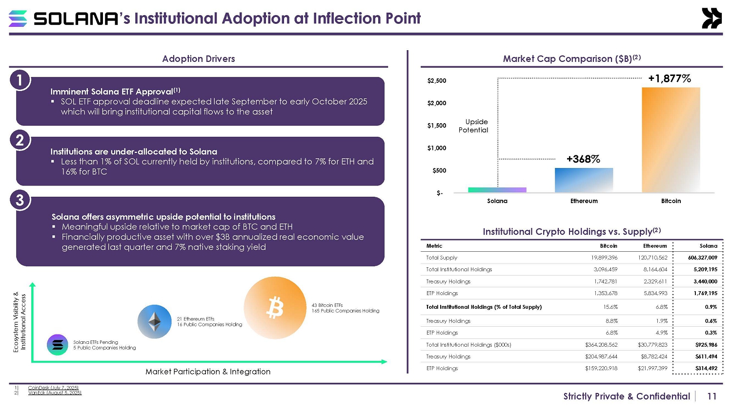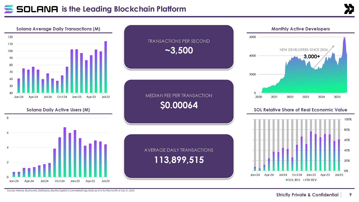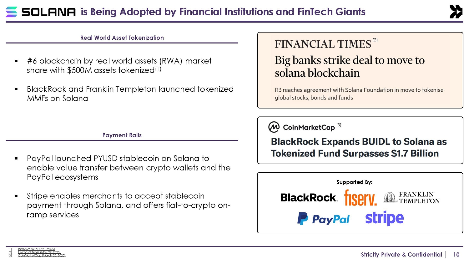 8 Strictly Private & Confidential ▪ ~3,500+ transactions per second with <400ms finality and consistent uptime ▪ <$0.01 fees per transaction that enables high volume activities The Fastest Blockchain ▪ 7,500+ new developers onboarded in 2024 ▪ 3.7M+ average daily active wallets with 23B+ transactions YTD The Most Widely Adopted Blockchain ▪ 5% of BTC market cap and 21% of ETH market cap ▪ 7% native staking yield with deflationary fee burning mechanism Financially Productive Asset with Asymmetric Upside ▪ Tokenized Fund by BlackRock, Apollo, Franklin Templeton and more ▪ Payment rails adoption by PayPal and Stripe Utilized by Blue - Chip Financial Institutions : Internet Capital Markets Sources: Blockworks Research, Electric Capital Crypto Developer Report 9 Strictly Private & Confidential is the Leading Blockchain Platform 40 50 60 70 80 90 100 110 120 Jan-24 Apr-24 Jul-24 Oct-24 Jan-25 Apr-25 Jul-25 0 2 4 6 8 Jan-24 Apr-24 Jul-24 Oct-24 Jan-25 Apr-25 Jul-25 0% 20% 40% 60% 80% 100% Jan-24 Apr-24 Jul-24 Oct-24 Jan-25 Apr-25 Jul-25 SOL REV ETH REV 0 2000 4000 6000 2020 2021 2022 2023 2024 2025 3,000+ NEW DEVELOPERS SINCE 2024 ~3,500 TRANSACTIONS PER SECOND $0.00064 MEDIAN FEE PER TRANSACTION 113,899,515 AVERAGE DAILY TRANSACTIONS Source: Artemis, Blockworks, DeFiLlama, ElectricCapital & CoinMarketCap; Data as of or for the month of July 31, 2025 Solana Average Daily Transactions (M) Solana Daily Active Users (M) Monthly Active Developers SOL Relative Share of Real Economic Value