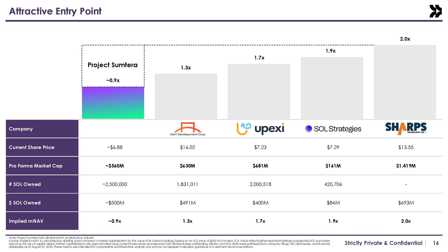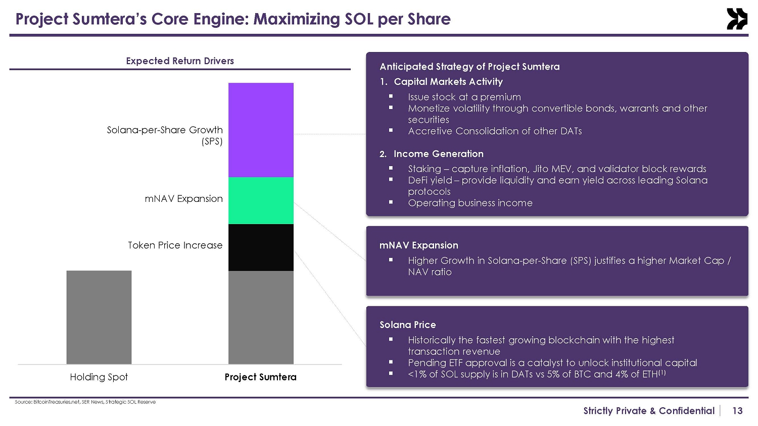 There can be no assurance that investments made in the future will have similar characteristics or results Performance Since Announcement First DAT Strategy Announcement mNAV PF NAV ($B) PF Market Cap ($B) Token Price Per Share Company Name Ticker 2690% Aug 2020 1.5x $69.6 $106.2 BTC $334.41 MicroStrategy MSTR 3060% Apr 2024 2.1x $2.1 $4.3 BTC ¥879.00 Metaplanet 3350 T 150% Apr 2025 1.8x $5.0 $8.8 BTC $23.03 Twenty One Capital CEP 800% May 2025 3.9x $0.8 $3.0 BTC $5.44 KindlyMD NAKA 200% May 2025 4.6x $1.5 $6.9 BTC $6.15 Strive Asset Management ASST 1060% Jun 2025 1.3x $7.6 $9.7 ETH $43.62 BitMine Immersion Technologies BMNR 220% May 2025 0.9x $3.3 $3.0 ETH $17.82 Sharplink Gaming SBET 40% Jun 2025 1.5x $0.5 $0.8 ETH $2.57 Bit Digital BTBT 100% Jul 2025 1.0x $0.8 $0.8 ETH $2.81 ETHzilla ETHZ 210% Apr 2025 1.7x $0.4 $0.7 SOL $7.23 Upexi UPXI 220% Apr 2025 1.3x $0.5 $0.6 SOL $16.02 DeFi Development Corp DFDV 80% Aug 2025 2.0x $0.7 $1.4 SOL $13.55 Sharp Technologies STSS 735% Sep 2024 1.9x $0.1 $0.2 SOL $7.29 Sol Strategies HODL CN 736% 2.0x Mean 220% 1.7x Median 16 Strictly Private & Confidential Attractive Entry Point Company $13.55 $7.29 $7.23 $16.02 ~$6.88 Current Share Price $1,419M $161M $681M $630M ~$560M Pro Forma Market Cap - 420,706 2,000,518 1,831,011 ~2,500,000 # SOL Owned $693M $84M $400M $491M ~$500M $ SOL Owned 2.0x 1.9x 1.7x 1.3x ~0.9x Implied mNAV ~0.9x 1.7x 1.9x 2.0x 1.3x Project Sumtera Note: Project Sumtera fully diluted mNAV at deal price of $6.88 Source: Implied mNAV is calculated by dividing each company‘s market capitalization by the value of its Solana holdings, base d o n an SOL price of $200 for Sumtera.