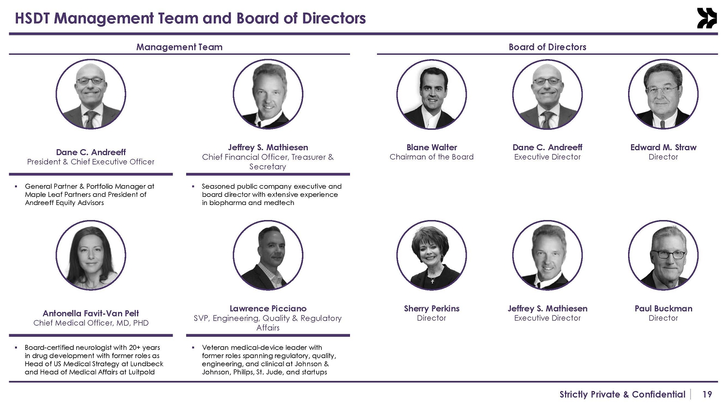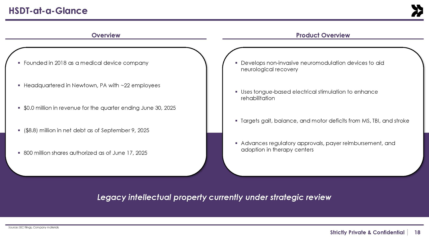 These metrics are intended for comparative and illustrative analysis only and do not represe nt valuation guidance or investment recommendations 17 Strictly Private & Confidential The Company’s New Directors and Advisory Board New Director Nominees New Advisory Board Leadership team to be enhanced with new additions to the Board of Directors as well as creation of new Advisory Board ▪ Founder & Chairman of Summer Capital ▪ Vice Chairman of AMINA Bank ▪ Former Head of Investment Banking, Asia at UBS Cosmo Jiang Director ▪ General Partner at Pantera Capital ▪ Leads the firm’s DAT investment practice ▪ Former Managing Partner, Nova River ▪ Former Managing Director, Hitchwood Capital ▪ Previously worked at Apollo in private equity and in M&A at Evercore [To be Announced] Joseph Chee Executive Chairman Dan Morehead Pantera | Founder, CEO 18 Strictly Private & Confidential HSDT - at - a - Glance Overview Product Overview ▪ Founded in 2018 as a medical device company ▪ Headquartered in Newtown, PA with ~22 employees ▪ $0.0 million in revenue for the quarter ending June 30, 2025 ▪ ($8.8) million in net debt as of September 9, 2025 ▪ 800 million shares authorized as of June 17, 2025 ▪ Develops non - invasive neuromodulation devices to aid neurological recovery ▪ Uses tongue - based electrical stimulation to enhance rehabilitation ▪ Targets gait, balance, and motor deficits from MS, TBI, and stroke ▪ Advances regulatory approvals, payer reimbursement, and adoption in therapy centers Legacy intellectual property currently under strategic review Source: SEC filings, Company materials