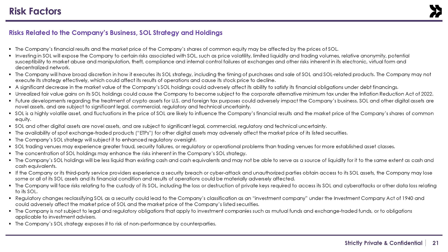 21 Strictly Private & Confidential Risk Factors ▪ The Company’s financial results and the market price of the Company’s shares of common equity may be affected by the prices o f S OL. ▪ Investing in SOL will expose the Company to certain risks associated with SOL, such as price volatility, limited liquidity an d t rading volumes, relative anonymity, potential susceptibility to market abuse and manipulation, theft, compliance and internal control failures at exchanges and other risks in herent in its electronic, virtual form and decentralized network. ▪ The Company will have broad discretion in how it executes its SOL strategy, including the timing of purchases and sale of SOL an d SOL - related products. The Company may not execute its strategy effectively, which could affect its results of operations and cause its stock price to decline. ▪ A significant decrease in the market value of the Company’s SOL holdings could adversely affect its ability to satisfy its fi nan cial obligations under debt financings. ▪ Unrealized fair value gains on its SOL holdings could cause the Company to become subject to the corporate alternative minimu m t ax under the Inflation Reduction Act of 2022. ▪ Future developments regarding the treatment of crypto assets for U.S. and foreign tax purposes could adversely impact the Com pan y’s business. SOL and other digital assets are novel assets, and are subject to significant legal, commercial, regulatory and technical uncertainty. ▪ SOL is a highly volatile asset, and fluctuations in the price of SOL are likely to influence the Company’s financial results and the market price of the Company’s shares of common equity. ▪ SOL and other digital assets are novel assets, and are subject to significant legal, commercial, regulatory and technical unc ert ainty. ▪ The availability of spot exchange - traded products (“ETPs”) for other digital assets may adversely affect the market price of its listed securities. ▪ The Company’s SOL strategy will subject it to enhanced regulatory oversight. ▪ SOL trading venues may experience greater fraud, security failures, or regulatory or operational problems than trading venues fo r more established asset classes. ▪ The concentration of SOL holdings may enhance the risks inherent in the Company’s SOL strategy. ▪ The Company’s SOL holdings will be less liquid than existing cash and cash equivalents and may not be able to serve as a sour ce of liquidity for it to the same extent as cash and cash equivalents. ▪ If the Company or its third - party service providers experience a security breach or cyber - attack and unauthorized parties obtain access to its SOL assets, the Company may lose some or all of its SOL assets and its financial condition and results of operations could be materially adversely affected. ▪ The Company will face risks relating to the custody of its SOL, including the loss or destruction of private keys required to ac cess its SOL and cyberattacks or other data loss relating to its SOL. ▪ Regulatory changes reclassifying SOL as a security could lead to the Company’s classification as an “investment company” unde r t he Investment Company Act of 1940 and could adversely affect the market price of SOL and the market price of the Company’s listed securities. ▪ The Company is not subject to legal and regulatory obligations that apply to investment companies such as mutual funds and ex cha nge - traded funds, or to obligations applicable to investment advisers. ▪ The Company’s SOL strategy exposes it to risk of non - performance by counterparties. Risks Related to the Company’s Business, SOL Strategy and Holdings 22 Strictly Private & Confidential Risk Factors (cont’d) ▪ The Company may be required to obtain the affirmative vote of shareholders in order to consummate this transaction.