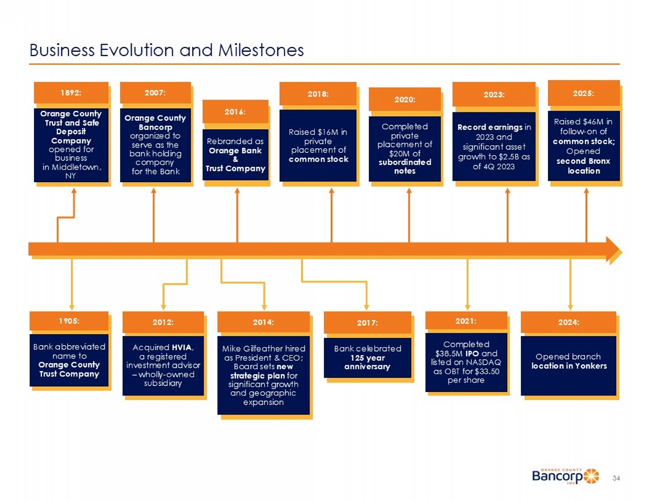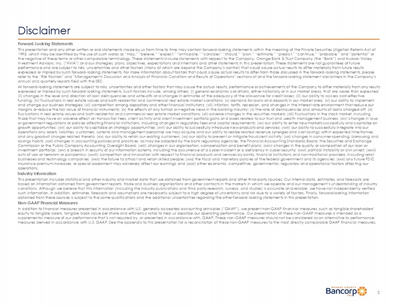 INVESTOR Presentation September 2025 Subordinated Notes Offering Disclaimer Forward - Looking Statements This presentation and any other written or oral statements made by us from time to time may contain forward - looking statements w ithin the meaning of the Private Securities Litigation Reform Act of 1995, which may be identified by the use of such words as “may,” “believe,” “expect,” “anticipate,” “consider,” “should,” “pl an, ” “estimate,” “predict,” “continue,” “probable,” and “potential” or the negative of these terms or other comparable terminology. These statements include statements with respect to the Company, Or ange Bank & Trust Company (the “Bank”) and Hudson Valley Investment Advisors, Inc. (“HVIA”) and our strategies, plans, objectives, expectations and intentions and other statements in th is presentation. These statements are not guarantees of future performance and are subject to risks, uncertainties and other factors (many of which are beyond the Company’s control) that c oul d cause actual results to differ materially from future results expressed or implied by such forward - looking statements. For more information about factors that could cause actual results to d iffer from those discussed in the forward - looking statements, please refer to the “Risk Factors” and “Management's Discussion and Analysis of Financial Condition and Results of Operations” secti ons of and the forward - looking statement disclaimers in the Company’s annual and quarterly reports filed with the SEC. All forward - looking statements are subject to risks, uncertainties and other factors that may cause the actual results, performa nce or achievements of the Company to differ materially from any results expressed or implied by such forward - looking statements. Such factors include, among others: (i) general economic conditions, ei ther nationally or in our market areas, that are worse than expected; (ii) changes in the level and direction of loan delinquencies and write - offs and changes in estimates of the adequacy of the all owance for credit losses; (iii) our ability to access cost - effective funding; (iv) fluctuations in real estate values and both residential and commercial real estate market conditions; (v) deman d f or loans and deposits in our market area; (vi) our ability to implement and change our business strategies; (vii) competition among depository and other financial institutions; (viii) inflation, ta rif fs, recession, and changes in the interest rate environment that reduce our margins or reduce the fair value of financial instruments; (ix) the effects of any turmoil or negative news in the banking in dus try; (x) the rate of delinquencies and amounts of loans charged - off; (xi) fluctuations in real estate values and both residential and commercial real estate market conditions; (xii) adverse changes i n t he securities markets; (xiii) fluctuations in the stock market, including those that may have an adverse effect on transaction fees, client activity and client investment portfolio gains and losses r ela ted to our trust and wealth management business; (xiv) changes in laws or government regulations or policies affecting financial institutions, including changes in regulatory fees and capital requ ire ments; (xv) our ability to enter new markets successfully and capitalize on growth opportunities; (xvi) our ability to capitalize on strategic opportunities; (xvii) our ability to successfully introduc e n ew products and services; (xviii) our ability to successfully integrate into our operations any assets, liabilities, customers, systems and management personnel we may acquire and our ability to realize rel ate d revenue synergies and cost savings within expected time frames, and any goodwill charges related thereto; (xix) our ability to retain our existing customers; (xx) our ability to prevent or mit igate fraudulent activity; (xxi) changes in consumer spending, borrowing and savings habits; (xxii) changes in accounting policies and practices, as may be adopted by the bank regulatory agencies, the F ina ncial Accounting Standards Board, the Securities and Exchange Commission or the Public Company Accounting Oversight Board; (xxiii) changes in our organization, compensation and benefit pl ans ; (xxiv) changes in the quality or composition of our loan or investment portfolios; (xxv) a breach in security of our information systems, including the occurrence of a cyber incident or a deficiency in cyber security; (xxvi) political instability or civil unrest; (xxvii) acts of war or terrorism or pandemics; (xxviii) competition and innovation with respect to financial products and services by ba nks, financial institutions and non - traditional providers, including retail businesses and technology companies; (xxix) the failure to attract and retain skilled people; (xxx) the fiscal and monetary p oli cies of the federal government and its agencies; (xxxi) any future FDIC insurance premium increases, or special assessment may adversely affect our earnings; and (xxxii) other economic, competitive , g overnmental, regulatory and operational factors affecting our operations. Industry Information This presentation includes statistical and other industry and market data that we obtained from government reports and other thi rd - party sources. Our internal data, estimates, and forecasts are based on information obtained from government reports, trade and business organizations and other contacts in the markets in whi ch we operate and our management’s understanding of industry conditions. Although we believe that this information (including the industry publications and third party research, surveys, an d studies) is accurate and reliable, we have not independently verified such information. In addition, estimates, forecasts and assumptions are necessarily subject to a high degree of uncertainty a nd risk due to a 