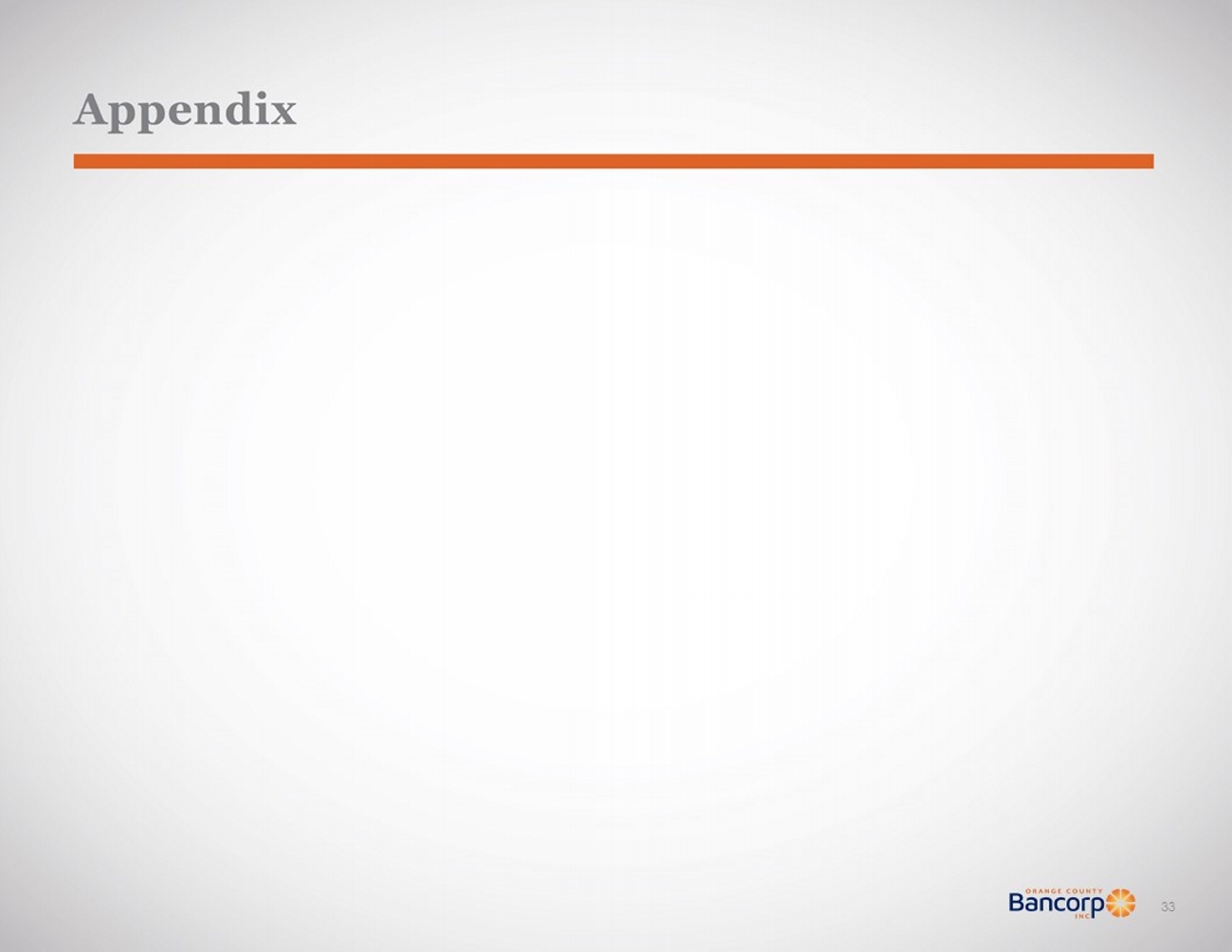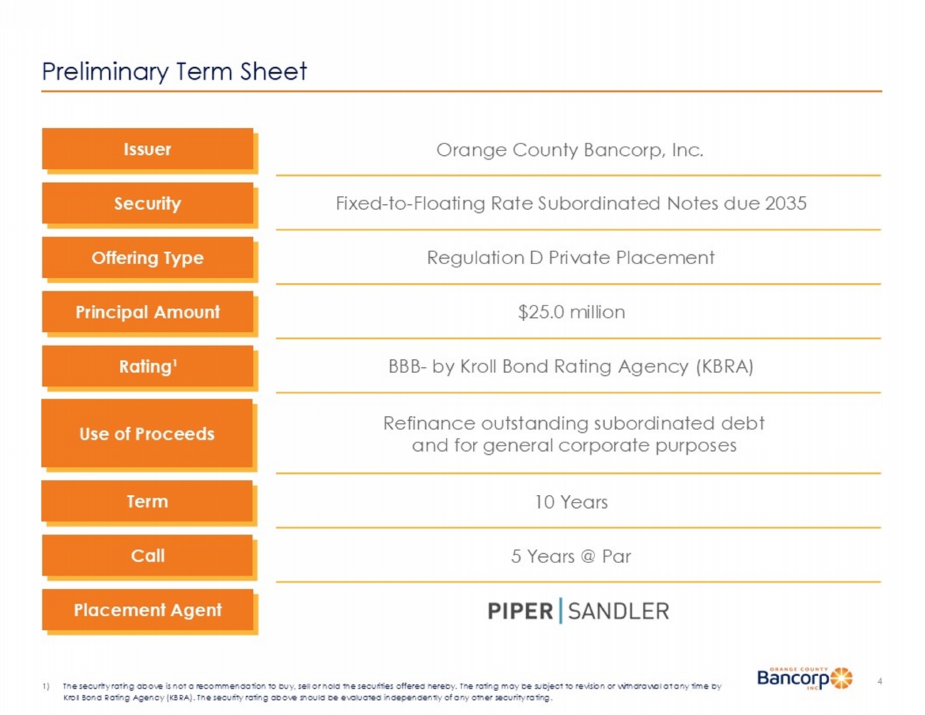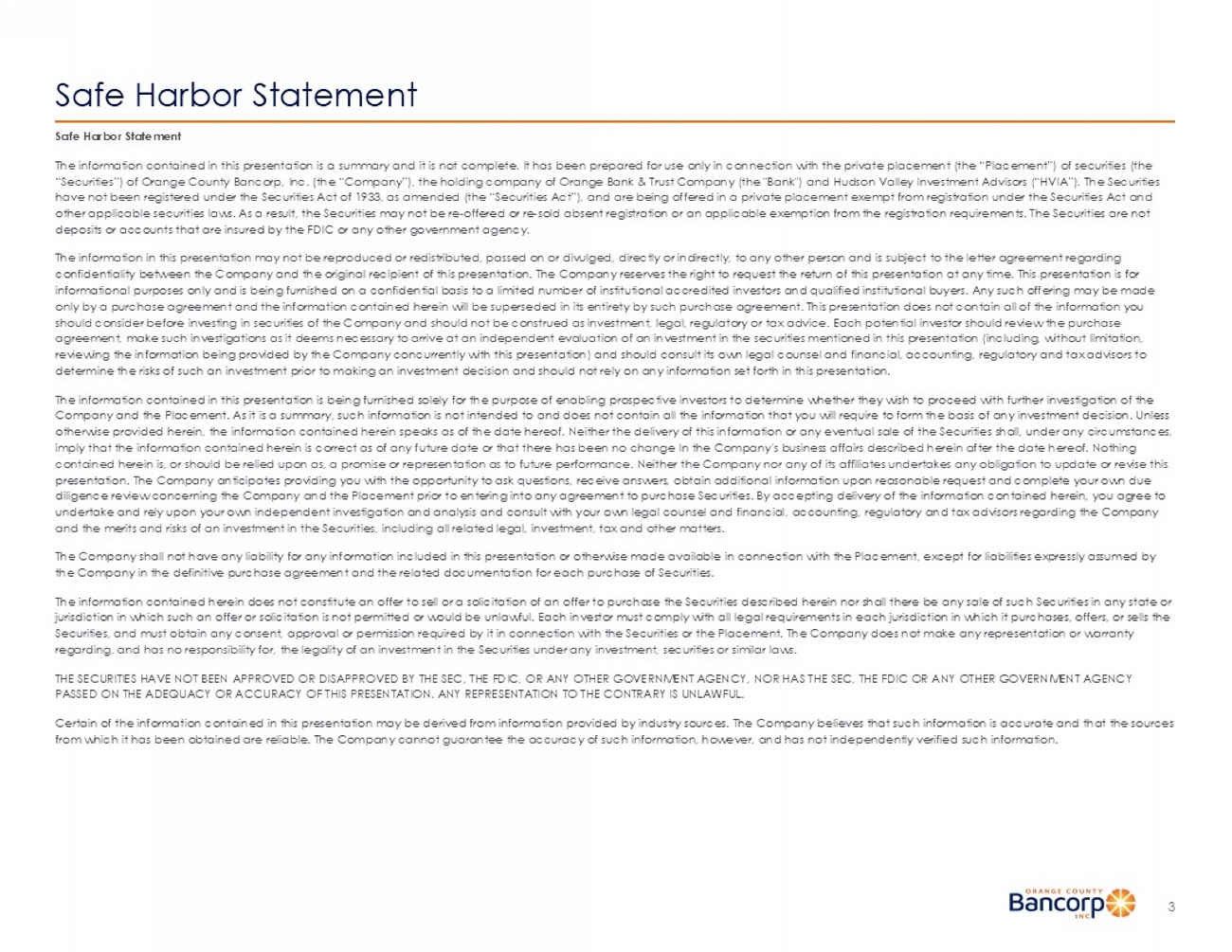 It has been prepared for use only in conn ect ion with the private placement (the “Placement”) of securities (the “Securities”) of Orange County Bancorp, Inc. (the “Company”), the holding company of Orange Bank & Trust Company (the "Bank") an d Hudson Valley Investment Advisors (“HVIA”). The Securities have not been registered under the Securities Act of 1933, as amended (the “Securities Act”), and are being offered in a priv ate placement exempt from registration under the Securities Act and other applicable securities laws. As a result, the Securities may not be re - offered or re - sold absent registration or an applica ble exemption from the registration requirements. The Securities are not deposits or accounts that are insured by the FDIC or any other government agency. The information in this presentation may not be reproduced or redistributed, passed on or divulged, directly or indirectly, t o a ny other person and is subject to the letter agreement regarding confidentiality between the Company and the original recipient of this presentation. The Company reserves the right to reques t t he return of this presentation at any time. This presentation is for informational purposes only and is being furnished on a confidential basis to a limited number of institutional accredited in ves tors and qualified institutional buyers. Any such offering may be made only by a purchase agreement and the information contained herein will be superseded in its entirety by such purchase agreeme nt. This presentation does not contain all of the information you should consider before investing in securities of the Company and should not be construed as investment, legal, regulatory or ta x advice. Each potential investor should review the purchase agreement, make such investigations as it deems necessary to arrive at an independent evaluation of an investment in the secu rit ies mentioned in this presentation (including, without limitation, reviewing the information being provided by the Company concurrently with this presentation) and should consult its own legal co unsel and financial, accounting, regulatory and tax advisors to determine the risks of such an investment prior to making an investment decision and should not rely on any information set f ort h in this presentation. The information contained in this presentation is being furnished solely for the purpose of enabling prospective investors to de termine whether they wish to proceed with further investigation of the Company and the Placement. As it is a summary, such information is not intended to and does not contain all the information t hat you will require to form the basis of any investment decision. Unless otherwise provided herein, the information contained herein speaks as of the date hereof. Neither the delivery of this inform ati on or any eventual sale of the Securities shall, under any circumstances, imply that the information contained herein is correct as of any future date or that there has been no change In the Company' s b usiness affairs described herein after the date hereof. Nothing contained herein is, or should be relied upon as, a promise or representation as to future performance. Neither the Company n or any of its affiliates undertakes any obligation to update or revise this presentation. The Company anticipates providing you with the opportunity to ask questions, receive answers, obtain additional in formation upon reasonable request and complete your own due diligence review concerning the Company and the Placement prior to entering into any agreement to purchase Securities. By acc ept ing delivery of the information contained herein, you agree to undertake and rely upon your own independent investigation and analysis and consult with your own legal counsel and financial , a ccounting, regulatory and tax advisors regarding the Company and the merits and risks of an investment in the Securities, including all related legal, investment, tax and other matters. The Company shall not have any liability for any information included in this presentation or otherwise made available in con nec tion with the Placement, except for liabilities expressly assumed by the Company in the definitive purchase agreement and the related documentation for each purchase of Securities. The information contained herein does not constitute an offer to sell or a solicitation of an offer to purchase the Securitie s d escribed herein nor shall there be any sale of such Securities in any state or jurisdiction in which such an offer or solicitation is not permitted or would be unlawful. Each investor must comply with all le gal requirements in each jurisdiction in which it purchases, offers, or sells the Securities, and must obtain any consent, approval or permission required by it in connection with the Securities or the Place men t. The Company does not make any representation or warranty regarding, and has no responsibility for, the legality of an investment in the Securities under any investment, securities or si milar laws. THE SECURITIES HAVE NOT BEEN APPROVED OR DISAPPROVED BY THE SEC, THE FDIC, OR ANY OTHER GOVERNMENT AGENCY, NOR HAS THE SEC, T HE FDIC OR ANY OTHER GOVERNMENT AGENCY PASSED ON THE ADEQUACY OR ACCURACY OF THIS PRESENTATION. ANY REPRESENTATION TO THE CONTRARY IS UNLAWFUL. Certain of the information contained in this presentation may be derived from information provided by industry sources. The C omp any believes that such information is accurate and that the sources from which it has been obtained are reliable. The Company cannot guarantee the accuracy of such information, however, and has no t independently verified such information. 3 Preliminary Term Sheet 4 Issuer Orange County Bancorp, Inc. Security Fixed - to - Floating Rate Subordinated Notes due 2035 Use of Proceeds Refinance outstanding subordinated debt and for general corporate purposes Term 10 Years Principal Amount $25.0 million Call 5 Year