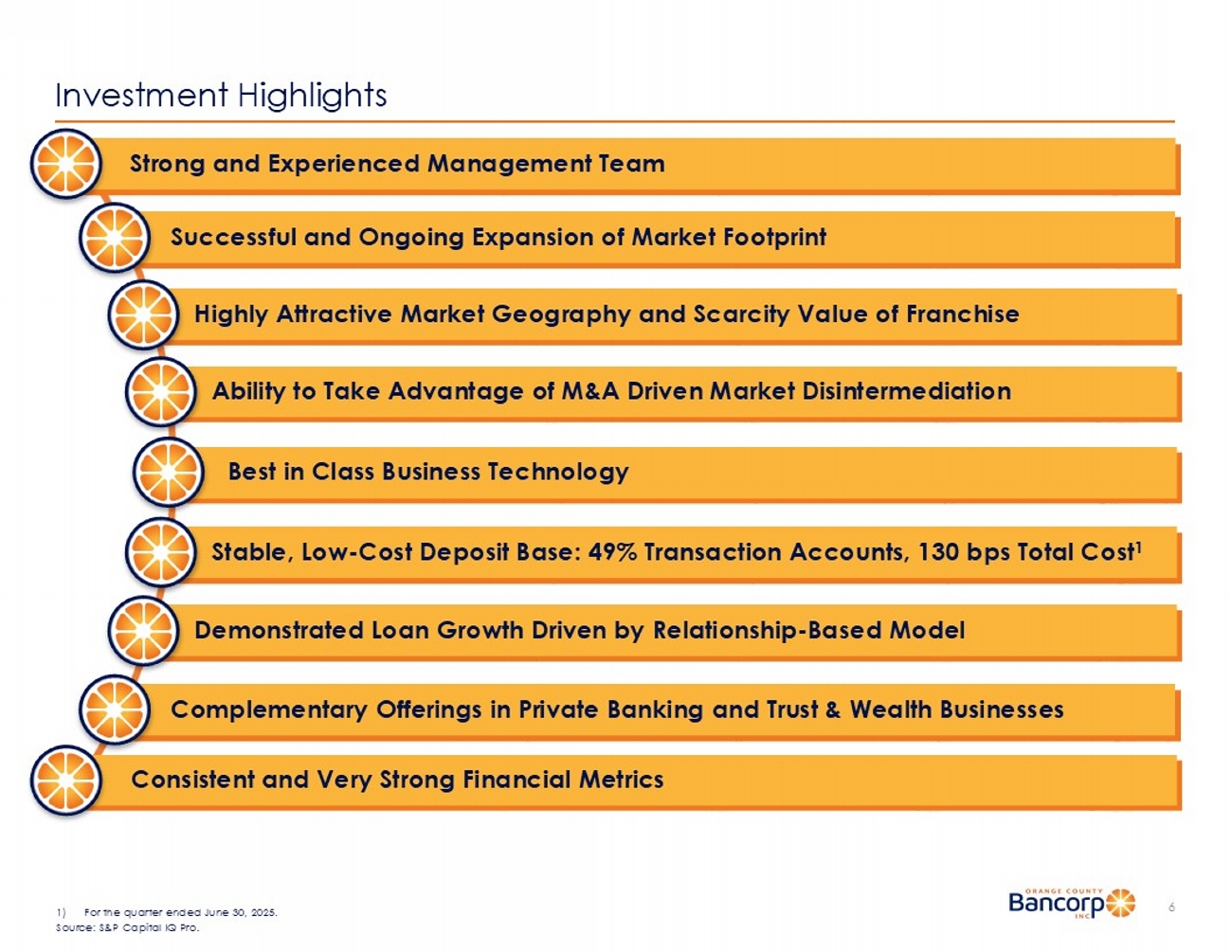 • Mr. Sousa became Chief Lending Officer of the Bank in July 2024 after serving as Executive Vice President and Chief Commercial Banking Officer since 2020. • Prior to joining the Bank, Mr. Sousa served as SVP and Branch Administrator at Hudson Valley Bank. Greg Sousa EVP and Chief Lending Officer Management Team 5 Experienced Leadership Team with Strong Ties to the Community Today’s Presenters • Mr. Gilfeather has been President, Chief Executive Officer and director of the Company and Bank since 2014. • Mr. Gilfeather also serves as a director of Hudson Valley Investment Advisors, the Company’s wealth management subsidiary. Prior to joining Orange County Bancorp, he served as Chief Administrative Officer at Hudson Valley Bank. Mr. Gilfeather brings over 35 years of experience to his leadership role. President, Chief Executive Officer and Director Michael Gilfeather • Mr. Listner became Chief Risk Officer of the Bank in March 2023, after serving as Senior Vice President and Chief Credit Officer of the Bank since March 2020. • Before joining the Bank, Mr. Listner served as SVP and Sr. Relationship Manager at Sun National Bank and BBVA Compass. Michael Listner SVP and Chief Risk Officer • Mr. Lesler joined the Bank in 2021 with over 20 years in the banking industry, including extensive senior leadership experience in financial and operational management. • Mr. Lesler served as Executive Vice President and Chief Operating Officer of BCB Bank and, prior to that, held the same role at Clifton Savings Bank. Michael Lesler E VP and Chief Financial Officer • Mr. Ruhl joined the Bank in January 2015 to lead the commercial business expansion into Westchester County. He is responsible for all bank - wide deposit growth. • Mr. Ruhl spent the first part of his career as a practicing attorney until joining Hudson Valley Bank. Joseph Ruhl EVP and Regional President of Westchester County • Mr. Dineen leads the asset management, trust and private banking services of the Company. • Mr. Dineen has over 35 years of banking industry experience, including positions with The Bank of New York, Commerce Bank, and Capital One. David Dineen EVP and Senior Managing Director of Wealth Management • Ms. Jones joined the Bank in 2016 as Vice President, Director of Branch and Deposit Operations. • Prior to joining Orange Bank & Trust, Ms. Jones worked at Sterling National Bank, where she served in ever - increasing operational and management roles during her 17 - year tenure. Elizabeth Jones EVP and Chief Operating Officer Investment Highlights 6 1) For the quarter ended June 30, 2025.