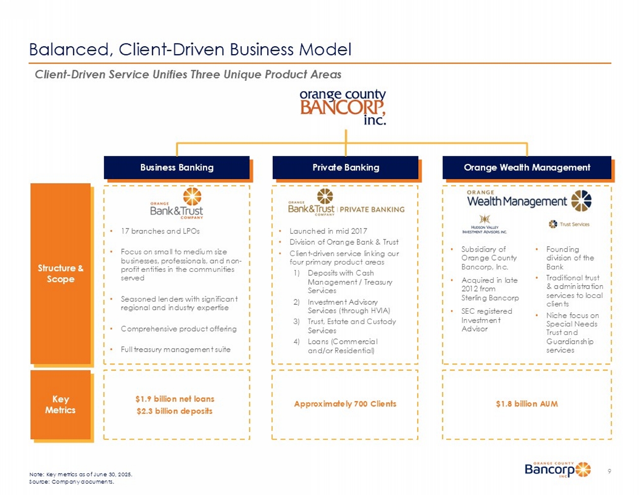 Source: S&P Capital IQ Pro. Background ▪ Successfully completed IPO and NASDAQ listing in August 2021 ▪ Bank was established in 1892 and has operated successfully for over 133 years ▪ Headquartered in Middletown, NY ▪ Operates through 17 branches and loan production offices ▪ Premier business bank in the Hudson Valley region, operating in diverse and stable markets ▪ Highly attractive core deposit franchise ▪ Full service commercial bank with focus on small to medium sized businesses ▪ Diverse, high - margin private banking and trust/wealth management service offerings Strong Banking Institution with Established Presence in Stable Markets Geographic Presence $1.9B TOTAL NET LOANS Company Background 2Q 2025 Snapshot - + + + + + + + - - 2015: Opened White Plains branch (Westchester) 2016: Opened Mamaroneck & Hawthorne branches (Westchester) 2017: Opened New City branch (Rockland) 2017: Opened Mount Vernon branch (Westchester) 2017: Closure of Vails Gate branch (Orange) 2018: Sale of Fishkill branch (Dutchess) 2018: Opened Cortlandt Manor branch (Westchester) 2019: Opened LPO in Bronx, NY market 2021: Opened Bronx branch and Nanuet branch (Rockland) 2024: Opened Yonkers branch (Westchester) 2025: Closure of one Middletown branch (Orange) 2025: Opened second Bronx branch Branches & LPOs (17) (1) Market Footprint Expansion of Franchise Footprint HVIA + $2.3B TOTAL DEPOSITS $2.6B TOTAL ASSETS $1.8B AUM + 1HZ<RUN3ULYDWH% 7& 2UDQJH&RXQW\%DQFRUS 1RUWKHDVW&RPPXQLW\ :DOGHQ6% &RQQHFW2QH 7RPSNLQV)LQDQFLDO 7UXVW&R%DQN&RUS :DOONLOO9DOOH\0+& 5LGJHZRRG6% 7%%,QYHVWPHQWV//& 5KLQHEHFN0+& )LUVW*UHHQZLFK)LQDQFLDO )LUVW)HGHUDO6DYLQJV 9HFWD,QF ,%&%DQFRUS,QF Franchise Located in Highly Attractive Markets 8 Attractive Demographics in a Large, Growing Addressable Market Median Household Income ($000s) 1) Lower Hudson Valley comprised of Orange, Westchester, and Rockland counties.