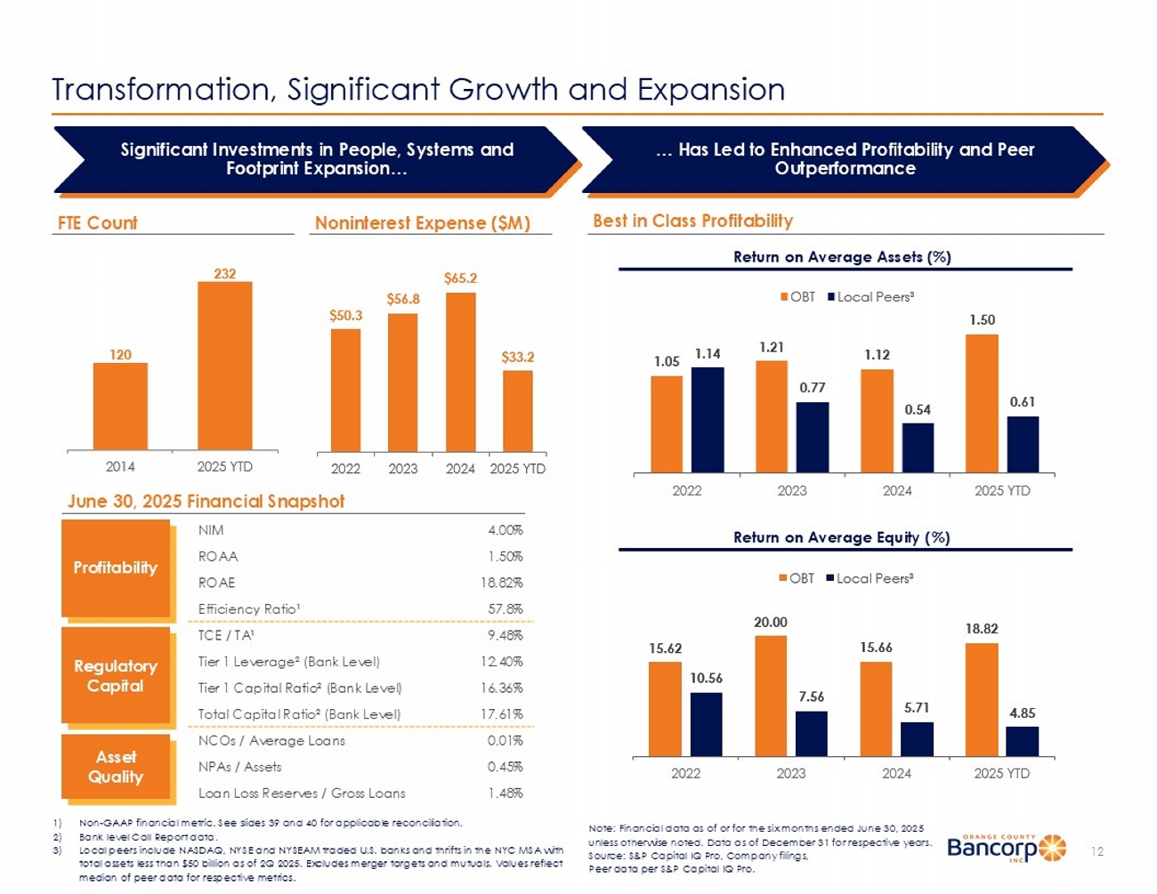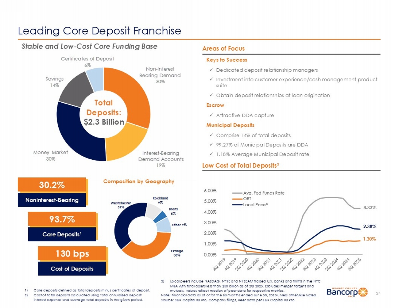 Source: Company documents. ($000s) Loan Type(s) Number of Total Loans Tenure of Relationship Total Exposure Total Balance As a (%) of Total Loans Customer 1 CRE Non-OO 16 6 Years $43,545 $43,545 2.27% Customer 2 Construction, C&I, CRE Non-OO 8 3 Years 42,408 38,158 1.99% Customer 3 CRE Non-OO, Construction 8 5 Years 38,857 38,857 2.03% Customer 4 Multifamily 2 4 Years 36,442 36,442 1.90% Customer 5 Construction, C&I, CRE Non-OO 5 3 Years 34,853 33,726 1.76% Customer 6 C&I, CRE Non-OO, CRE OO 8 15 Years 34,690 30,354 1.58% Customer 7 C&I, CRE Non-OO 3 3 Years 32,100 23,440 1.22% Customer 8 Multifamily, CRE Non-OO 3 2 Years 28,850 28,850 1.50% Customer 9 C&I, CRE Non-OO, CRE OO, Construction, 1-4 Family 27 10 Years 27,683 25,161 1.31% Customer 10 C&I, Multifamily, Construction 19 11 Years 26,649 25,470 1.33% Customer 11 C&I, Construction 2 4 Years 26,500 6,045 0.32% Customer 12 Multifamily, CRE Non-OO 7 6 Years 25,103 25,103 1.31% Customer 13 Multifamily, C&I, Construction 9 3 Years 22,396 20,773 1.08% Customer 14 C&I, CRE Non-OO, Small Business 6 6 Years 21,474 19,394 1.01% Customer 15 CRE Non-OO 4 4 Years 21,228 21,228 1.11% Customer 16 CRE Non-OO, 1-4 Family 7 9 Years 20,537 18,537 0.97% Customer 17 CRE Non-OO, C&I 4 9 Years 20,197 18,397 0.96% Customer 18 C&I 2 3 Years 20,000 6,000 0.31% Customer 19 Multifamily 2 3 Years 19,150 19,150 1.00% Customer 20 Multifamily, CRE Non-OO 5 7 Years 18,724 18,724 0.98% Top 20 Borrowers Total 147 $561,387 $497,354 25.93% Average 7 6 Years $28,069 $24,868 1.30% Credit Quality 23 1) Local peers include NASDAQ, NYSE and NYSEAM traded U.S. banks and thrifts in the NYC MSA with total assets less than $50 bill ion as of 2Q 2025. Excludes merger targets and mutuals. Values reflect median of peer data for respective metrics. Note: Financial data as of or for the six months ended June 30, 2025 unless otherwise noted. Data as of December 31 for respe cti ve years. Source: Company documents, Company filings, Peer data per S&P Capital IQ Pro. Asset Quality Has Been Historically Sound, Managed Well Through Cycles • Strong and resilient credit culture throughout cycles • OBT recorded a $ 9.6 M provision for loan losses in 2024 and net charge - offs of $ 9.0M, mainly related to one participation • OBT recorded a $2.48M provision for loan losses during the six months ended June 30, 2025 and net charge - offs of $148k • At 1.48% of gross loans, the Company’s reserve level is above local peers¹ and well - positioned for any potential downturn in credit cycles Credit Quality Commentary <7' 0.08 0.37 0.07 0.49 0.01 0.04 0.02 0.08 0.08 0.07 2021 2022 2023 2024 2025 YTD NPAs / Assets (%) Net Charge - off (NCOs) / Average Loans (%) 1.37 1.39 1.44 1.44 1.48 1.08 0.97 0.98 0.97 0.98 2021 2022 2023 2024 2025 YTD Loan Loss Reserve / Gross Loans (%) 4 2%7 /RFDO3HHUV ñ $11.7 million Non - Performing Loans (0.61% of Total Loans) $28.4 million Loan Loss Reserve (243% of NPLs)