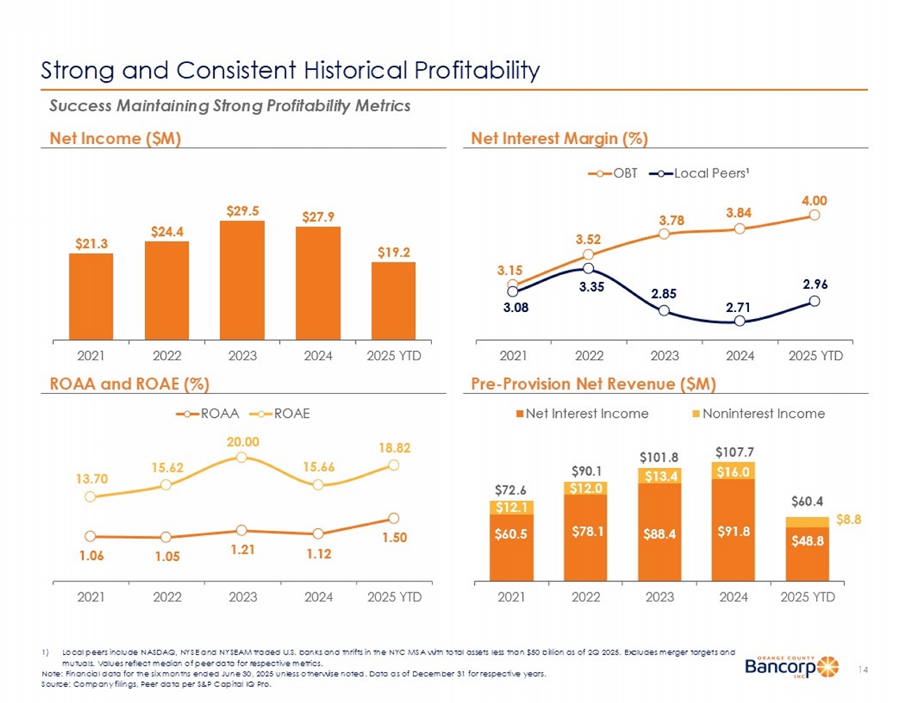 See slides 39 and 40 for applicable reconciliation. 2) Bank level Call Report data. 3) Local peers include NASDAQ, NYSE and NYSEAM traded U.S. banks and thrifts in the NYC MSA with total assets less than $50 billion as of 2Q 2025. Excludes merger targets and mutuals. Values reflect median of peer data for respective metrics. <7' 2%7 /RFDO3HHUV ó Profitability 4.00% NIM 1.50% ROAA 18.82% ROAE 57.8% Efficiency Ratio¹ 9.48% TCE / TA¹ 12.40% Tier 1 Leverage² (Bank Level) 16.36% Tier 1 Capital Ratio² (Bank Level) 17.61% Total Capital Ratio² (Bank Level) 0.01% NCOs / Average Loans 0.45% NPAs / Assets 1.48% Loan Loss Reserves / Gross Loans Regulatory Capital Asset Quality June 30, 2025 Financial Snapshot Note: Financial data as of or for the six months ended June 30, 2025 unless otherwise noted. Data as of December 31 for respective years. Source: S&P Capital IQ Pro, Company filings, Peer data per S&P Capital IQ Pro. Return on Average Equity (%) <7' 2%7 /RFDO3HHUV ó <7' <7' <7' <7' Consistent History of Growth 13 Note: Financial data as of the six months ended June 30, 2025 unless otherwise noted.
