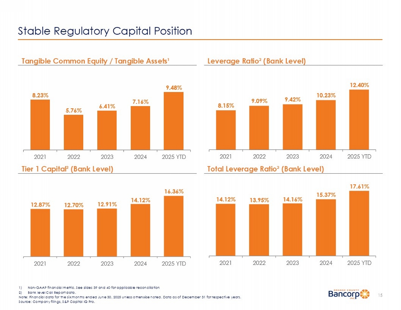 See slides 39 and 40 for applicable reconciliation 2) Bank level Call Report data. Note: Financial data for the six months ended June 30, 2025 unless otherwise noted. Data as of December 31 for respective yea rs. Source: Company filings, S&P Capital IQ Pro. Leverage Ratio² (Bank Level) Tangible Common Equity / Tangible Assets¹ Total Leverage Ratio² (Bank Level) Tier 1 Capital² (Bank Level)