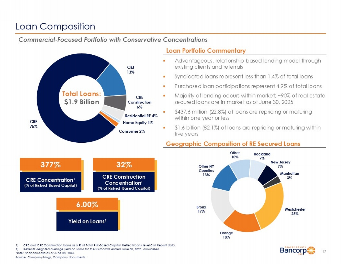 <7' <7' 6HUYLFH&KDUJHV RQ'HSRVLWV 7UXVW,QFRPH ,QYHVWPHQW$GYLVRU\ +9,$ (DUQLQJV RQ%2/, 3URFHHGV IURP%2/, *DLQRQ6DOH RI$VVHWV ò 2WKHU ,QYHVWPHQW &RPSDQ\ ,QGLYLGXDOV 3URILWVKDULQJ &RUSRUDWLRQV +LJK1HW:RUWK &KDULW\ 2WKHU ó Diversified Revenue Sources 1) Based on annualized 2Q 2025 trust and investment advisory fee income. 2) “Gain on Sale of Assets” category includes $727 thousand loss on sale of investment securities and $1.2 million gain associated with the sale of branch location in 2Q 2025. 3) “Other” AUM category is comprised of Profit Sharing and State Entity assets Noninterest Income Composition Total AUM: $1.8 Billion AUM Composition Unique and complementary ability to offer private banking and wealth management services to OBT clients ▪ Client - driven success of the Orange Wealth Management initiative, which includes services offered by HVIA, private banking and the trust department in a coordinated strategy for growth ▪ Trust Services (Division of the Bank): offering traditional trust and administration services to local clients and with a niche focus on Special Needs Trust and Guardianship service ▪ HVIA: RIA offering asset management, financial planning and wealth management services Demonstrated Growth in Revenue & AUM Noninterest Income to Total Revenue: 26.0% HVIA AUM: $1.17 Billion (64.0% of the total) Trust Dept. AUM: $657.2 Million (36.0% of the total) Total AUM ($B) 16 Total Noninterest Income : $11.7 Million Trust & Investment Advisory Fee Income ($M) Note: Financial data as of or for the six months ended June 30, 2025 unless otherwise noted. Data as of December 31 for respective years. Source: Company filings, Company documents.