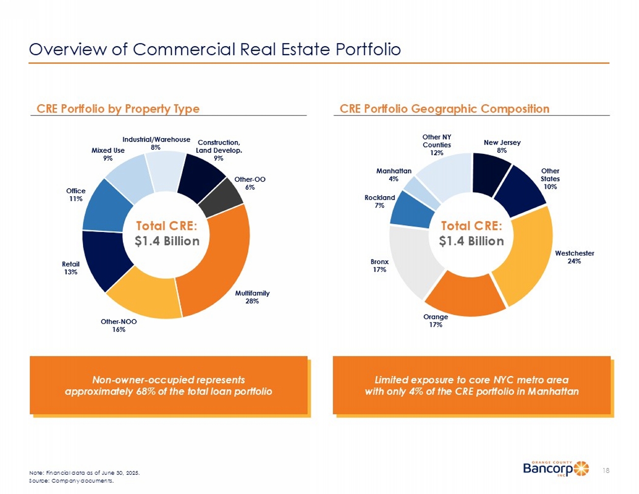 :HVWFKHVWHU 2UDQJH %URQ[ 2WKHU1< &RXQWLHV 2WKHU 5RFNODQG 1HZ-HUVH\ 0DQKDWWDQ &5( & , &5( &RQVWUXFWLRQ 5HVLGHQWLDO5( +RPH(TXLW\ &RQVXPHU Loan Composition 17 1) CRE and CRE Construction loans as a % of Total Risk - Based Capital. Reflects bank level Call Report data. 2) Reflects weighted average yield on loans for the six months ended June 30, 2025, annualized. Note: Financial data as of June 30, 2025. Source: Company filings, Company documents. Total Loans: $1.9 Billion Commercial - Focused Portfolio with Conservative Concentrations ▪ Advantageous, relationship - based lending model through existing clients and referrals ▪ Syndicated loans represent less than 1.4% of total loans ▪ Purchased loan participations represent 4.9% of total loans ▪ Majority of lending occurs within market; ~90% of real estate secured loans are in market as of June 30, 2025 ▪ $437.6 million (22.8%) of loans are repricing or maturing within one year or less ▪ $1.6 billion (82.1%) of loans are repricing or maturing within five years Geographic Composition of RE Secured Loans Loan Portfolio Commentary 6.00% Yield on Loans² 377% CRE Concentration¹ (% of Risked - Based Capital) 32% CRE Construction Concentration¹ (% of Risked - Based Capital)