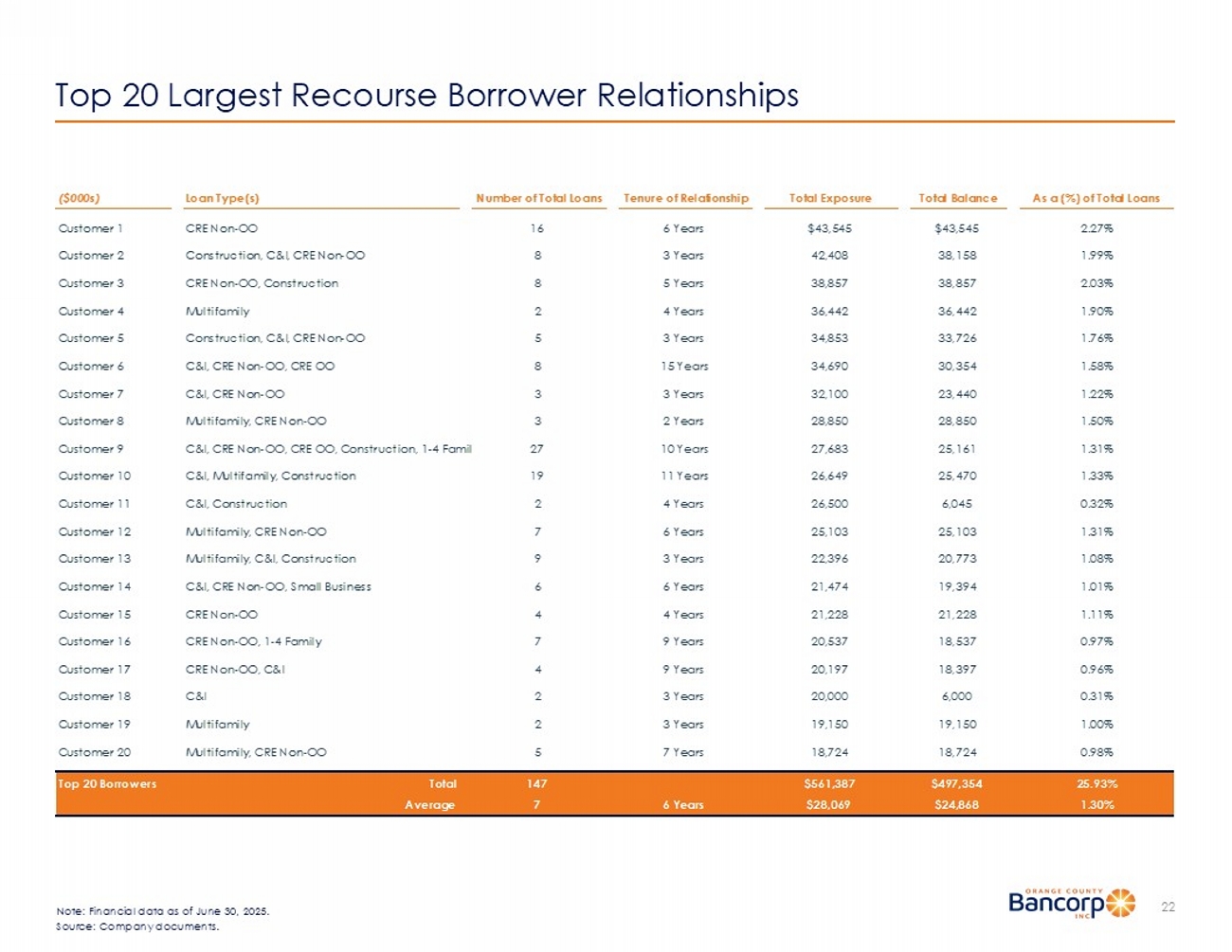 Source: Company documents. Office Portfolio Overview % of Total Office Portfolio Portfolio Characteristic 1.7% % of Portfolio in the Bronx and Queens None % of Portfolio in Manhattan 8.6% % Maturing in 2025 7.4% % Maturing in 2026 20.5% % Maturing in 2027 63.5% % Maturing in 2028+ Weighted Average LTV 54.8% Average Loan Size $2.21 Million 2UDQJH 0LGGOHVH[ %HUJHQ :HVWFKHVWHU 5RFNODQG 1DVVDX 2WKHU1< &RXQWLHV 2WKHU6WDWHV Total Office: $137 Million Office Portfolio Geographic Composition Orange 18% Westchester 22% Other 26% Bergen 1% Rockland 5% Nassau 3% Other NY Counties 25% Other NJ Counties 1% Overview of C&I Portfolio 21 Note: Financial data as of June 30, 2025.