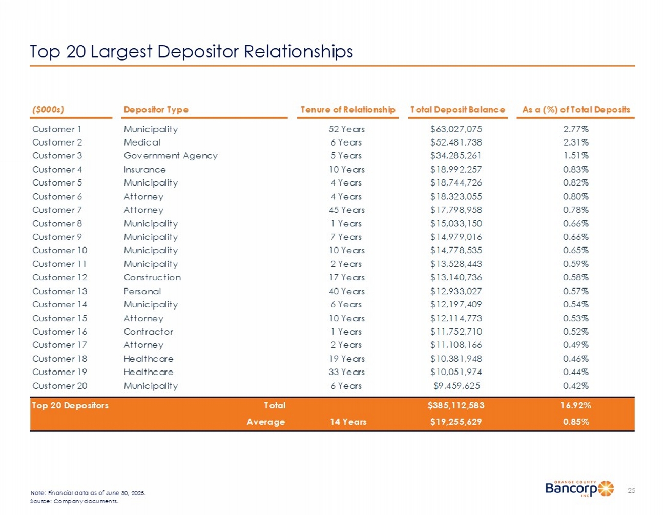 $YJ )HG)XQGV5DWH 2%7 /RFDO3HHUV ó Orange 38% Westchester 39% Rockland 9% Bronx 5% Other 9% Leading Core Deposit Franchise Areas of Focus Keys to Success x Dedicated deposit relationship managers x Investment into customer experience/cash management product suite x Obtain deposit relationships at loan origination Escrow x Attractive DDA capture Municipal Deposits x Comprise 14% of total deposits x 99.27% of Municipal Deposits are DDA x 1.18% Average Municipal Deposit rate 24 Low Cost of Total Deposits² Stable and Low - Cost Core Funding Base Non - Interest Bearing Demand 30% Interest - Bearing Demand Accounts 19% Money Market 30% Savings 14% Certificates of Deposit 6% Total Deposits: $2.3 Billion Composition by Geography 30.2% Noninterest - Bearing 93.7% Core Deposits¹ 130 bps Cost of Deposits 1) Core deposits defined as total deposits minus certificates of deposit. 2) Cost of total deposits calculated using total annualized deposit interest expense and average total deposits in the given period. 3) Local peers include NASDAQ, NYSE and NYSEAM traded U.S. banks and thrifts in the NYC MSA with total assets less than $50 billion as of 2Q 2025. Excludes merger targets and mutuals. Values reflect median of peer data for respective metrics. Note: Financial data as of or for the six months ended June 30, 2025 unless otherwise noted. Source: S&P Capital IQ Pro, Company filings, Peer data per S&P Capital IQ Pro.