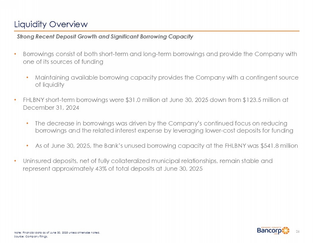 Top 20 Largest Depositor Relationships 25 Note: Financial data as of June 30, 2025. Source: Company documents. ($000s) Depositor Type Tenure of Relationship Total Deposit Balance As a (%) of Total Deposits Customer 1 Municipality 52 Years $63,027,075 2.77% Customer 2 Medical 6 Years $52,481,738 2.31% Customer 3 Government Agency 5 Years $34,285,261 1.51% Customer 4 Insurance 10 Years $18,992,257 0.83% Customer 5 Municipality 4 Years $18,744,726 0.82% Customer 6 Attorney 4 Years $18,323,055 0.80% Customer 7 Attorney 45 Years $17,798,958 0.78% Customer 8 Municipality 1 Years $15,033,150 0.66% Customer 9 Municipality 7 Years $14,979,016 0.66% Customer 10 Municipality 10 Years $14,778,535 0.65% Customer 11 Municipality 2 Years $13,528,443 0.59% Customer 12 Construction 17 Years $13,140,736 0.58% Customer 13 Personal 40 Years $12,933,027 0.57% Customer 14 Municipality 6 Years $12,197,409 0.54% Customer 15 Attorney 10 Years $12,114,773 0.53% Customer 16 Contractor 1 Years $11,752,710 0.52% Customer 17 Attorney 2 Years $11,108,166 0.49% Customer 18 Healthcare 19 Years $10,381,948 0.46% Customer 19 Healthcare 33 Years $10,051,974 0.44% Customer 20 Municipality 6 Years $9,459,625 0.42% Top 20 Depositors Total $385,112,583 16.92% Average 14 Years $19,255,629 0.85% Liquidity Overview 26 Note: Financial data as of June 30, 2025 unless otherwise noted.