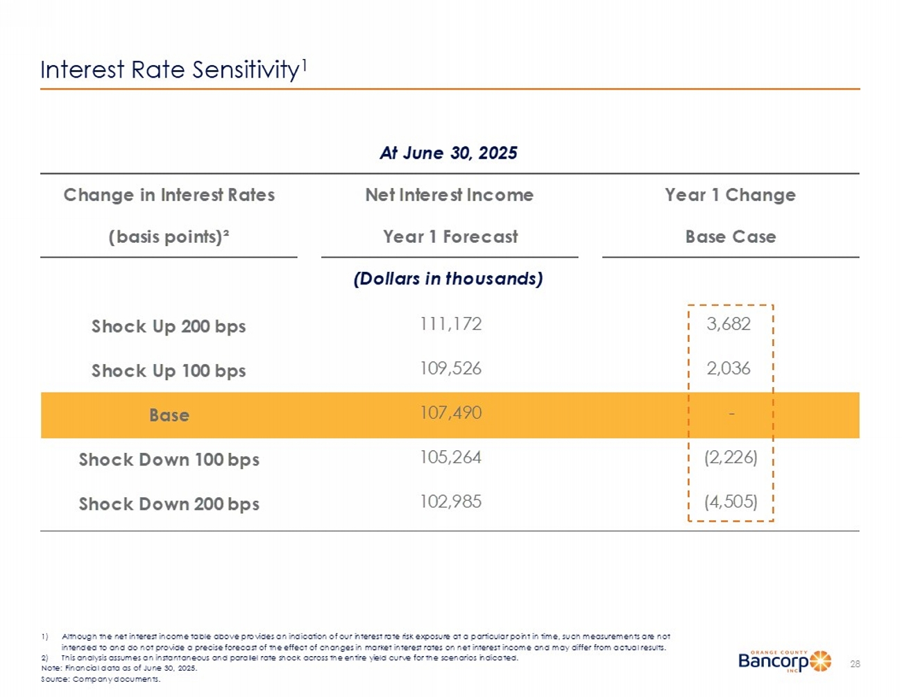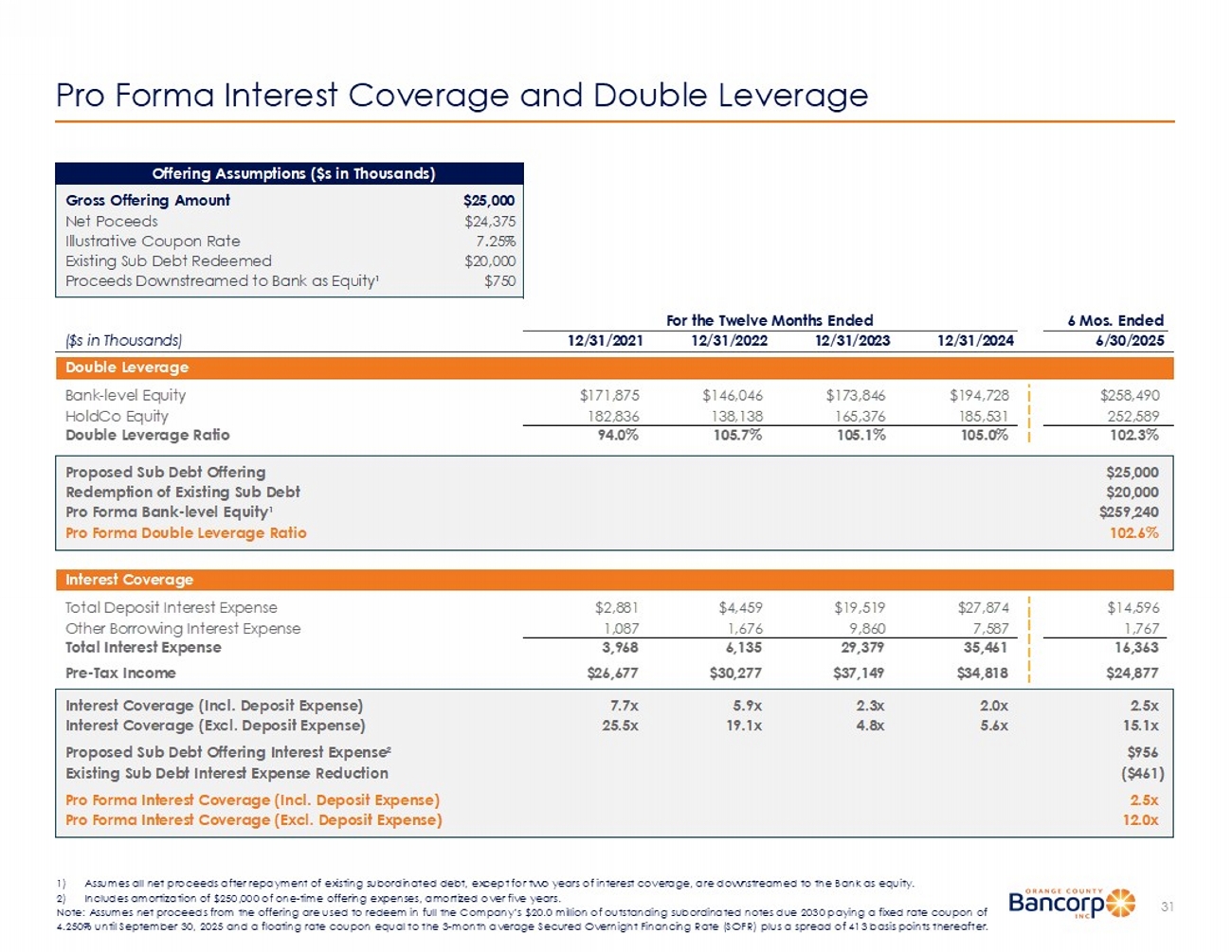 AOCI) 1 12.43% 12.40% Tier 1 Leverage Ratio 2 16.39% 16.36% Tier 1 Capital Ratio 2 17.65% 17.61% Total Capital Ratio 2 377% 377% CRE Concentration 2 (% of Risk - Based Capital) 32% 32% CRE Construction Concentration 2 (% of Risk - Based Capital) As of June 30, 2025 1) Non - GAAP financial metric, see slides 39 and 40 for applicable reconciliation. 2) Bank level Call Report data. 3) Pro Forma capital ratios assume gross offering amount of $25.0 million with net proceeds, except for two years of interest co ver age, after redemption in full of the Company’s $20.0 million of outstanding subordinated notes due 2030, downstreamed to the Bank as equity; See page 31 for detailed offeri ng assumptions.