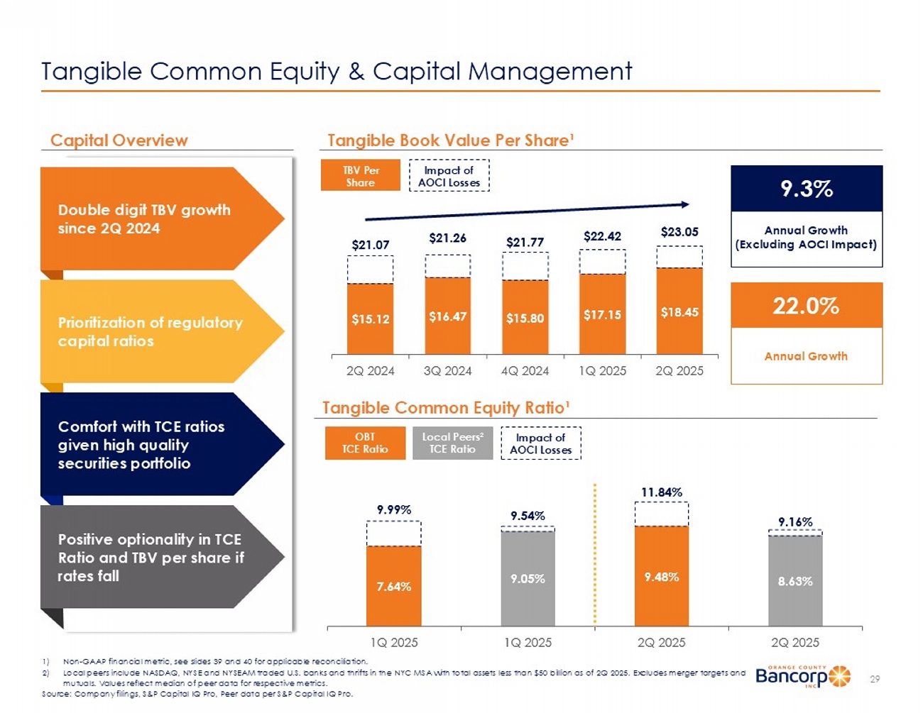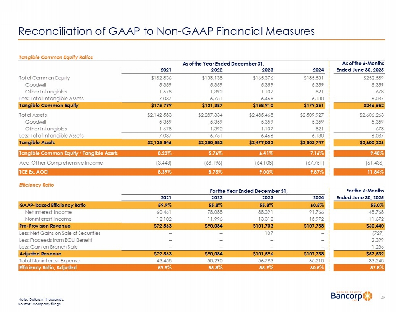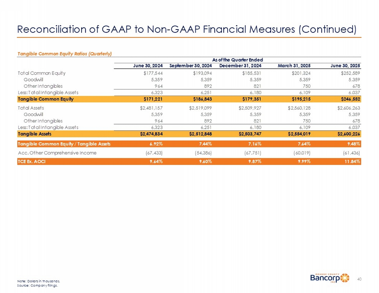 Tangible Common Equity Ratios (Quarterly) As of the Quarter Ended June 30, 2024 September 30, 2024 December 31, 2024 March 31, 2025 June 30, 2025 Total Common Equity $177,544 $193,094 $185,531 $201,324 $252,589 Goodwill 5,359 5,359 5,359 5,359 5,359 Other Intangibles 964 892 821 750 678 Less: Total Intangible Assets 6,323 6,251 6,180 6,109 6,037 Tangible Common Equity $171,221 $186,843 $179,351 $195,215 $246,552 Total Assets $2,481,157 $2,519,099 $2,509,927 $2,560,128 $2,606,263 Goodwill 5,359 5,359 5,359 5,359 5,359 Other Intangibles 964 892 821 750 678 Less: Total Intangible Assets 6,323 6,251 6,180 6,109 6,037 Tangible Assets $2,474,834 $2,512,848 $2,503,747 $2,554,019 $2,600,226 Tangible Common Equity / Tangible Assets 6.92% 7.44% 7.16% 7.64% 9.48% Acc. Other Comprehensive Income (67,433) (54,386) (67,751) (60,019) (61,436) TCE Ex. AOCI 9.64% 9.60% 9.87% 9.99% 11.84% Reconciliation of GAAP to Non - GAAP Financial Measures (Continued) 40 Note: Dollars in thousands. Source: Company filings.
