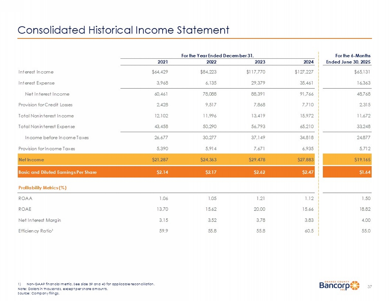 NY OBT 2,606 84.2 0.45 0.01 1.48 9.48 11.84 1.17 15.1 3.90 60.1 35 Consolidated Historical Balance Sheet 36 As of the Year Ended December 31, As of the 6-Months 2021 2022 2023 2024 Ended June 30, 2025 Assets Cash and due from banks $306,179 $86,081 $147,383 $150,334 $175,606 Investment securities — available-for-sale 464,797 533,461 489,948 443,775 410,814 Restricted investment in bank stocks 2,217 9,562 14,525 9,716 5,618 Total Cash & Securities 773,193 629,104 651,856 603,825 592,038 Gross Loans 1,291,428 1,569,430 1,747,062 1,815,751 1,917,802 Allowance for credit losses 17,661 21,832 25,182 26,077 28,408 Total Net Loans 1,273,767 1,547,598 1,721,880 1,789,674 1,889,394 Goodwill 5,359 5,359 5,359 5,359 5,359 Other Intangible Assets 1,678 1,392 1,107 821 678 Total Intangible Assets 7,037 6,751 6,466 6,180 6,037 Other Assets 88,586 103,881 105,266 110,248 118,794 Total Assets $2,142,583 $2,287,334 $2,485,468 $2,509,927 $2,606,263 Liabilities Deposits $1,914,384 $1,974,387 $2,038,749 $2,153,359 $2,276,723 FHLB Advances – 131,500 234,500 123,500 31,000 Subordinated notes, net of issuance costs 19,376 19,447 19,520 19,591 19,626 Other Borrowings 3,000 – – – – Total Debt 22,376 150,947 254,020 143,091 50,626 Accrued expenses and other liabilities 22,987 23,862 27,323 27,946 26,325 Total Liabilities $1,959,747 $2,149,196 $2,320,092 $2,324,396 $2,353,674 Equity Total Shareholders' Equity $182,836 $138,138 $165,376 $185,531 $252,589 Total Liabilities & Shareholders' Equity $2,142,583 $2,287,334 $2,485,468 $2,509,927 $2,606,263 Note: Dollars in thousands. Source: Company filings.