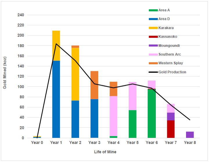 The PEA and mine plan outline the design of an open pit gold mining operation feeding a central gold processing facility over the 8.1-year LOM. The assessment anticipates the concurrent development of multiple deposits, including Area A, Area D, Karakara, Western Splay, Kassassoko, Moungoundi, and Southern Arc, with no more than three pits mined at any one time (refer to Figure 1).