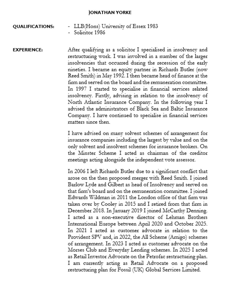 | Retail Advocate | means Jon Yorke, experience and CV being appended at Schedule 5 |