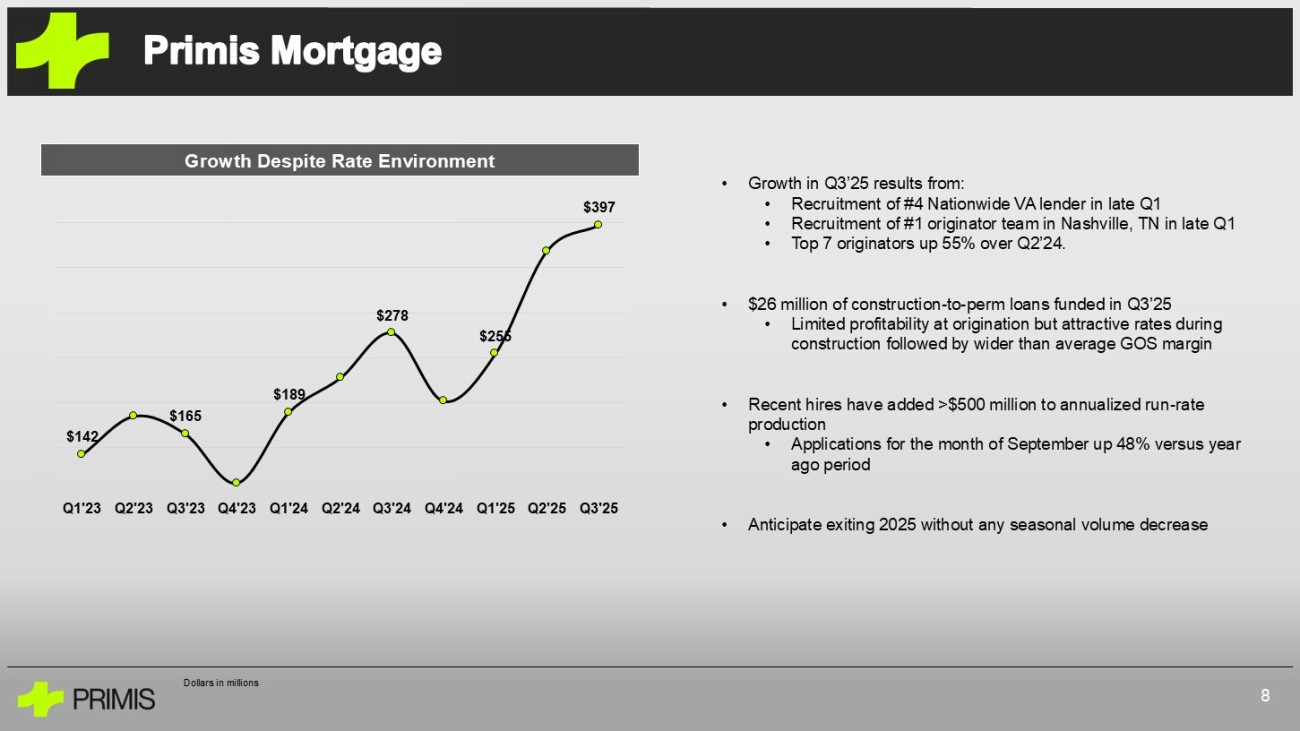 プリミス・モーゲージの2025年第3四半期の住宅ローン成約高は、前年同期比34%増の3億800万ドルであった。プリミス・モーゲージの2025年第3四半期の税引き前利益は約190万ドルで、新規チーム加入の影響を受けた2025年第2四半期の0.1百万ドル、2024年第3四半期の1.1百万ドルから大幅に増加した。