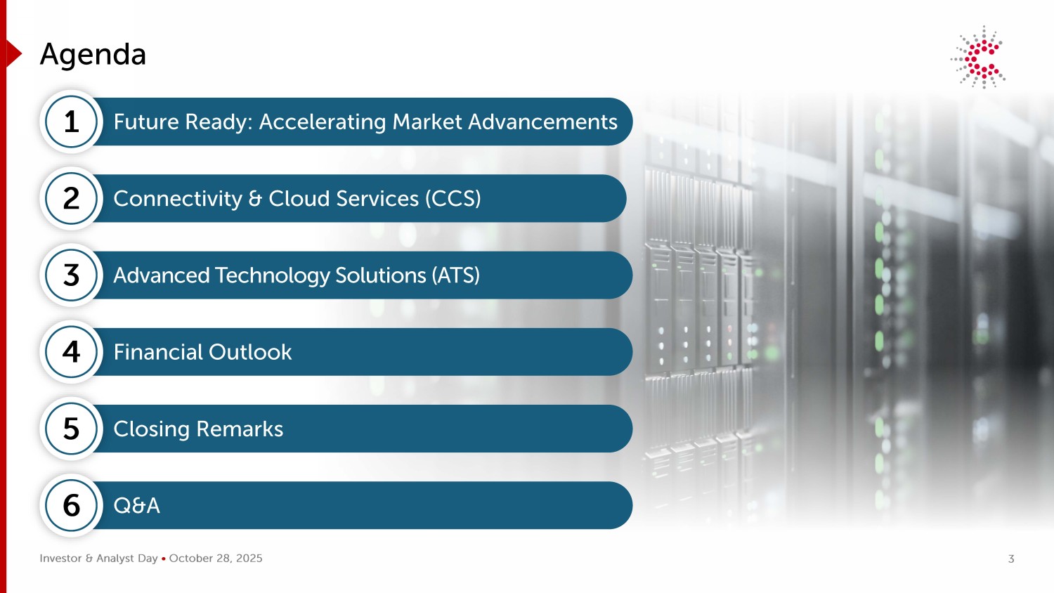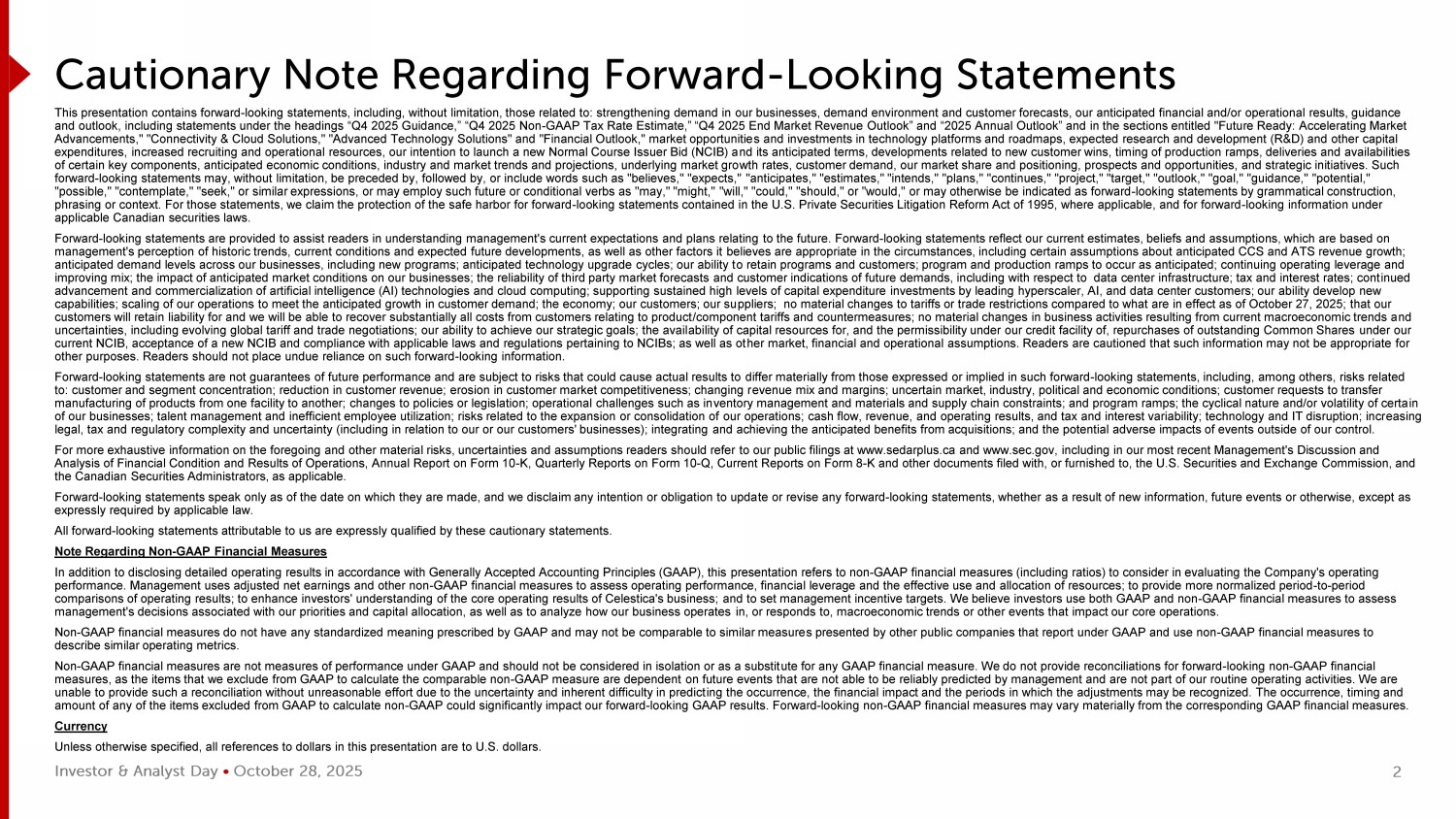 Investor & Analyst Day • October 28, 2025 Cautionary Note Regarding Forward - Looking Statements This presentation contains forward - looking statements, including, without limitation, those related to: strengthening demand in our businesses, demand environment and customer forecasts, our anticipated financial and/or operational results, guidance and outlook, including statements under the headings “Q4 2025 Guidance,” “Q4 2025 Non - GAAP Tax Rate Estimate,” “Q4 2025 End Mark et Revenue Outlook” and “2025 Annual Outlook” and in the sections entitled "Future Ready: Accelerating Market Advancements," "Connectivity & Cloud Solutions," "Advanced Technology Solutions" and "Financial Outlook," market opportunitie s a nd investments in technology platforms and roadmaps, expected research and development (R&D) and other capital expenditures, increased recruiting and operational resources, our intention to launch a new Normal Course Issuer Bid (NCIB) a nd its anticipated terms, developments related to new customer wins, timing of production ramps, deliveries and availabilities of certain key components, anticipated economic conditions, industry and market trends and projections, underlying market gro wth rates, customer demand, our market share and positioning, prospects and opportunities, and strategic initiatives. Such forward - looking statements may, without limitation, be preceded by, followed by, or include words such as "believes," "expects," "anticipates," "estimates," "intends," "plans," "continues," "project," "target," "outlook," "goal," "guidance," "potential," "possible," "contemplate," "seek," or similar expressions, or may employ such future or conditional verbs as "may," "might," "wi ll," "could," "should," or "would," or may otherwise be indicated as forward - looking statements by grammatical construction, phrasing or context. For those statements, we claim the protection of the safe harbor for forward - looking statements contained i n the U.S. Private Securities Litigation Reform Act of 1995, where applicable, and for forward - looking information under applicable Canadian securities laws. Forward - looking statements are provided to assist readers in understanding management's current expectations and plans relating to the future. Forward - looking statements reflect our current estimates, beliefs and assumptions, which are based on management's perception of historic trends, current conditions and expected future developments, as well as other factors it bel ieves are appropriate in the circumstances, including certain assumptions about anticipated CCS and ATS revenue growth; anticipated demand levels across our businesses, including new programs; anticipated technology upgrade cycles; our ability t o r etain programs and customers; program and production ramps to occur as anticipated; continuing operating leverage and improving mix; the impact of anticipated market conditions on our businesses; the reliability of third party market forecasts an d customer indications of future demands, including with respect to data center infrastructure; tax and interest rates; cont inu ed advancement and commercialization of artificial intelligence (AI) technologies and cloud computing; supporting sustained high le vels of capital expenditure investments by leading hyperscaler , AI, and data center customers; our ability develop new capabilities; scaling of our operations to meet the anticipated growth in customer demand; the economy; our customers; our su ppl iers; no material changes to tariffs or trade restrictions compared to what are in effect as of October 27, 2025; that our customers will retain liability for and we will be able to recover substantially all costs from customers relating to product /co mponent tariffs and countermeasures; no material changes in business activities resulting from current macroeconomic trends a nd uncertainties, including evolving global tariff and trade negotiations; our ability to achieve our strategic goals; the avail abi lity of capital resources for, and the permissibility under our credit facility of, repurchases of outstanding Common Shares und er our current NCIB, acceptance of a new NCIB and compliance with applicable laws and regulations pertaining to NCIBs; as well as ot her market, financial and operational assumptions. Readers are cautioned that such information may not be appropriate for other purposes. Readers should not place undue reliance on such forward - looking information. Forward - looking statements are not guarantees of future performance and are subject to risks that could cause actual results to differ materially from those expressed or implied in such forward - looking statements, including, among others, risks related to: customer and segment concentration; reduction in customer revenue; erosion in customer market competitiveness; changing r eve nue mix and margins; uncertain market, industry, political and economic conditions; customer requests to transfer manufacturing of products from one facility to another; changes to policies or legislation; operational challenges such as in ven tory management and materials and supply chain constraints; and program ramps; the cyclical nature and/or volatility of certa in of our businesses; talent management and inefficient employee utilization; risks related to the expansion or consolidation of ou r operations; cash flow, revenue, and operating results, and tax and interest variability; technology and IT disruption; incr eas ing legal, tax and regulatory complexity and uncertainty (including in relation to our or our customers' businesses); integrating an d achieving the anticipated benefits from acquisitions; and the potential adverse impacts of events outside of our control. For more exhaustive information on the foregoing and other material risks, uncertainties and assumptions readers should refer to our public filings at www.sedarplus.ca and www.sec.gov, includi