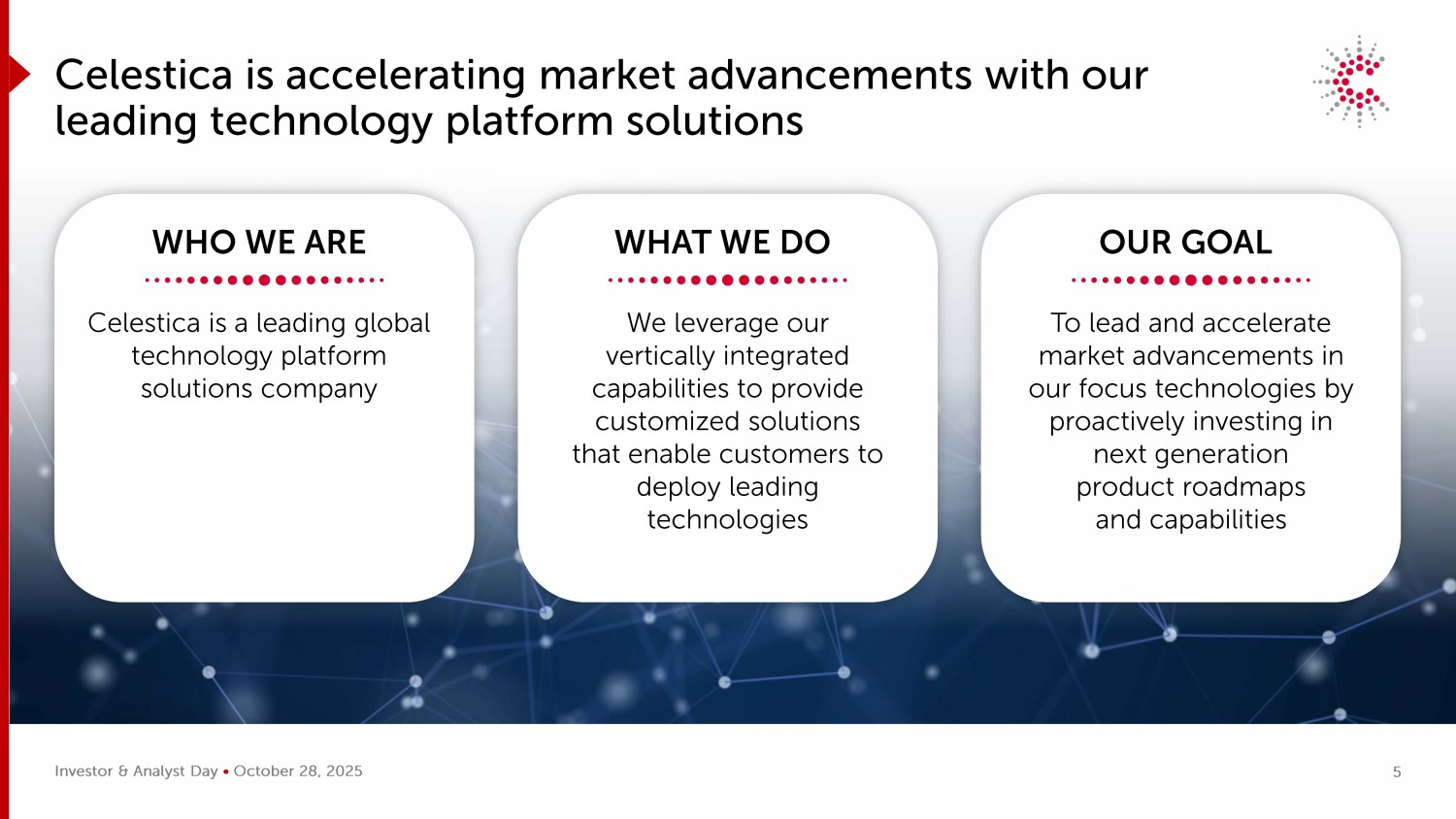 2025 INVESTOR & ANALYST DAY Future Ready: Accelerating Market Advancements Rob Mionis President and Chief Executive Officer Investor & Analyst Day • October 28, 2025 Celestica is accelerating market advancements with our leading technology platform solutions WHO WE ARE Celestica is a leading global technology platform solutions company We leverage our vertically integrated capabilities to provide customized solutions that enable customers to deploy leading technologies WHAT WE DO To lead and accelerate market advancements in our focus technologies by proactively investing in next generation product roadmaps and capabilities OUR GOAL 5 Investor & Analyst Day • October 28, 2025 Leveraging vertically integrated capabilities to deliver customized platform solutions Technology Platform Solution Manufacturing Supply Chain After Market Services Software Design, Engineering & Testing 6