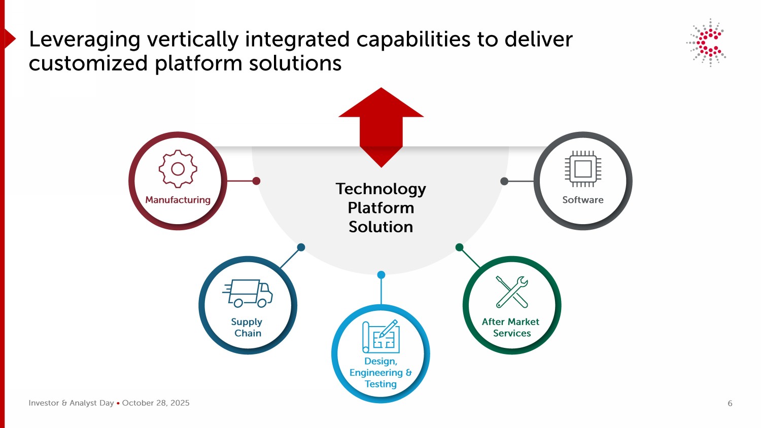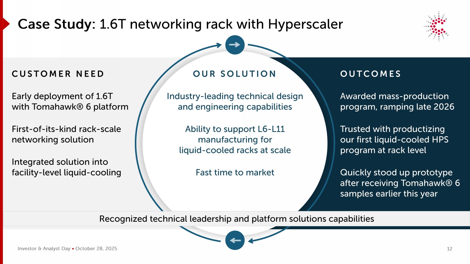 Investor & Analyst Day • October 28, 2025 Case Study: 1.6T networking rack with Hyperscaler CUSTOMER NEED Early deployment of 1.6T with Tomahawk® 6 platform First - of - its - kind rack - scale networking solution Integrated solution into facility - level liquid - cooling OUTCOMES Awarded mass - production program, ramping late 2026 Trusted with productizing our first liquid - cooled HPS program at rack level Quickly stood up prototype after receiving Tomahawk® 6 samples earlier this year OUR SOLUTION Industry - leading technical design and engineering capabilities Ability to support L6 - L11 manufacturing for liquid - cooled racks at scale Fast time to market Recognized technical leadership and platform solutions capabilities 12 Investor & Analyst Day • October 28, 2025 Our key drivers of success Industry - leading positions in high - growth markets Accelerate market advancements through technology leadership Best - in - class operational execution 1 2 3 13