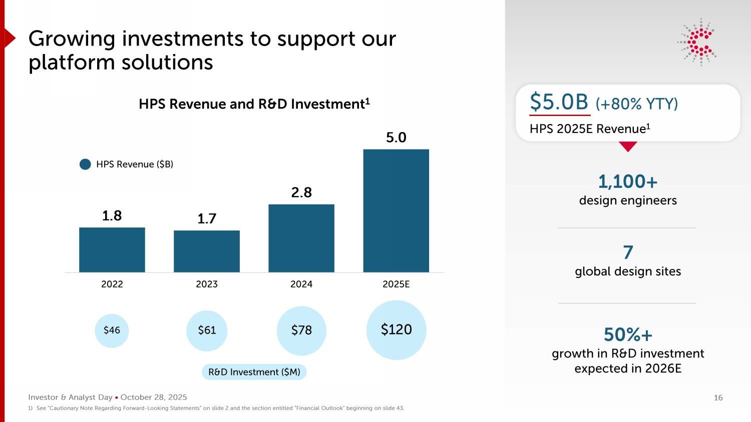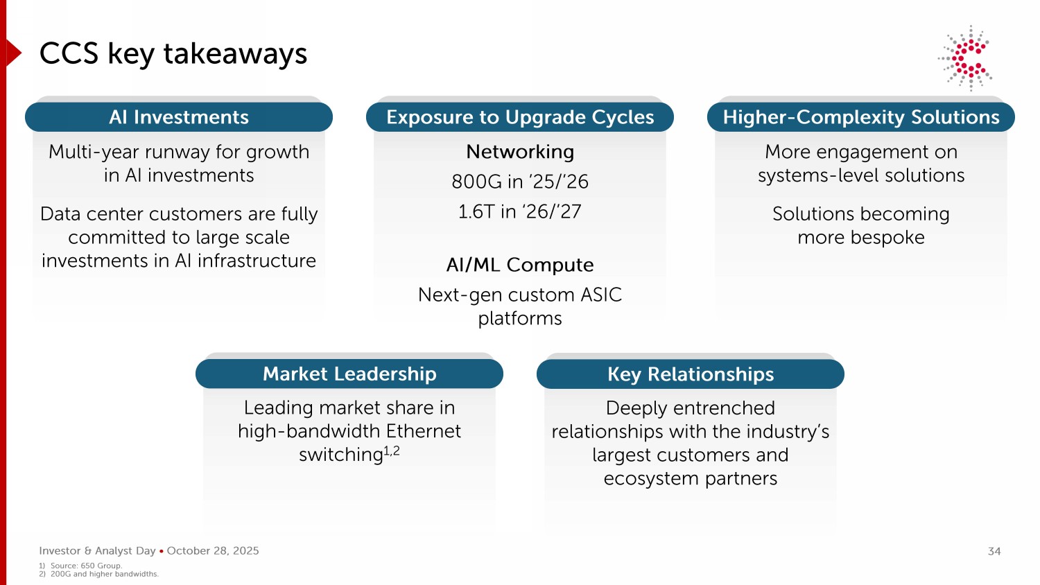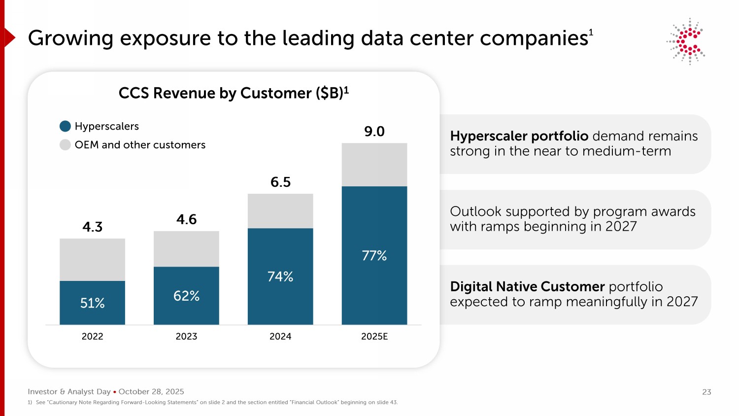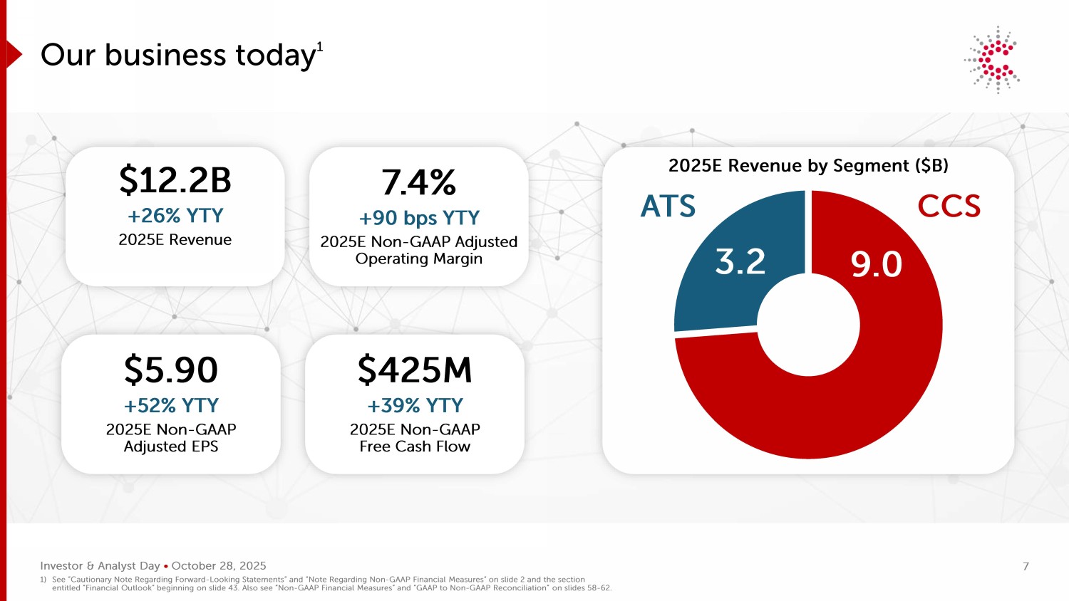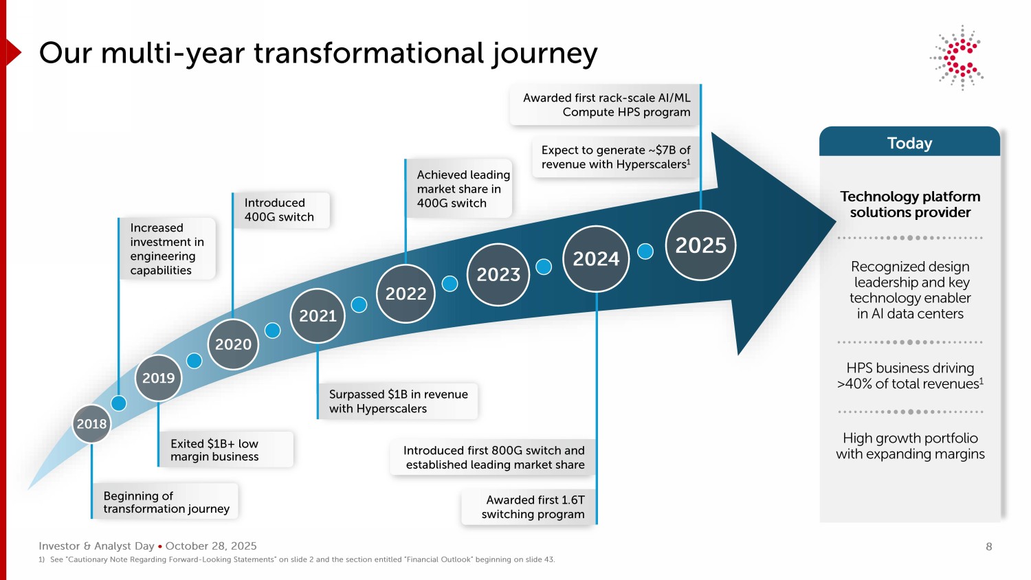 Investor & Analyst Day • October 28, 2025 9.0 3.2 ATS CCS Our business today 1 $12.2B +26% YTY 2025E Revenue $5.90 +52% YTY 2025E Non - GAAP Adjusted EPS $425M +39% YTY 2025E Non - GAAP Free Cash Flow 7.4% +90 bps YTY 2025E Non - GAAP Adjusted Operating Margin 2025E Revenue by Segment ($B) 1) See “Cautionary Note Regarding Forward - Looking Statements” and “Note Regarding Non - GAAP Financial Measures” on slide 2 and the s ection entitled “Financial Outlook” beginning on slide 43. Also see “Non - GAAP Financial Measures” and “GAAP to Non - GAAP Reconciliation” on slides 58 - 62. 7 Investor & Analyst Day • October 28, 2025 Technology platform solutions provider Recognized design leadership and key technology enabler in AI data centers HPS business driving >40% of total revenues 1 High growth portfolio with expanding margins Today Beginning of transformation journey Our multi - year transformational journey Increased investment in engineering capabilities Introduced 400G switch Exited $1B+ low margin business Surpassed $1B in revenue with Hyperscalers Achieved leading market share in 400G switch Awarded first 1.6T switching program Introduced first 800G switch and established leading market share Expect to generate ~$7B of revenue with Hyperscalers 1 Awarded first rack - scale AI/ML Compute HPS program 1) See “Cautionary Note Regarding Forward - Looking Statements” on slide 2 and the section entitled “Financial Outlook” beginning on slide 43.