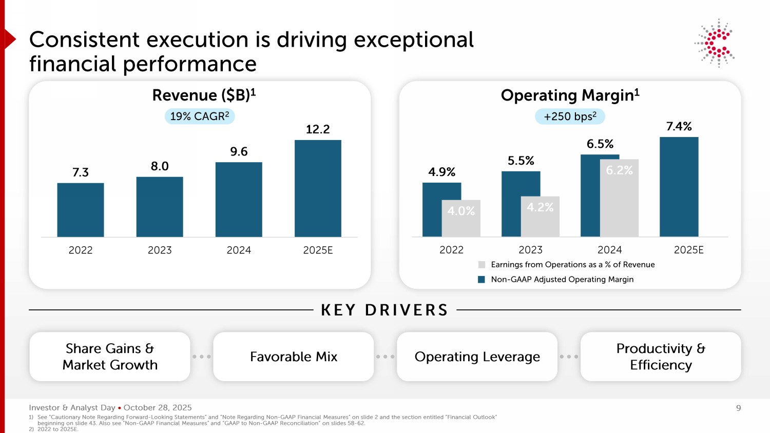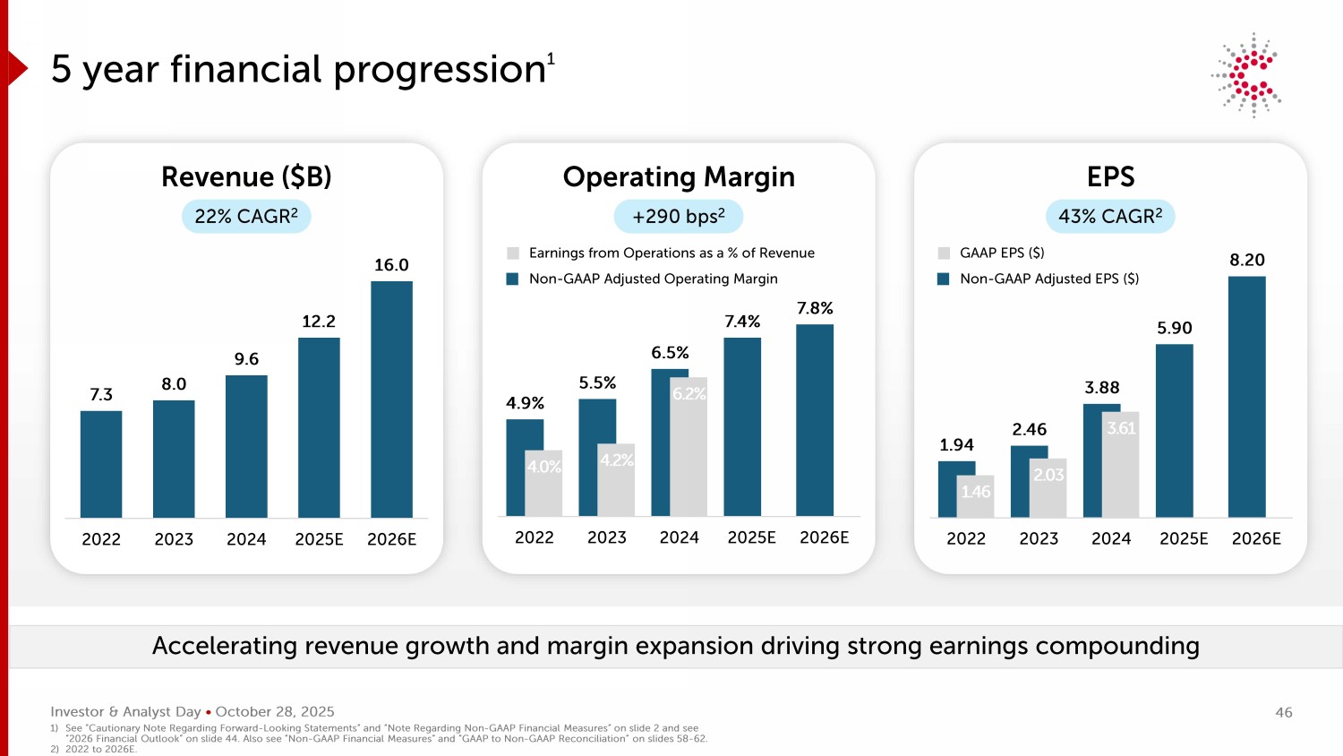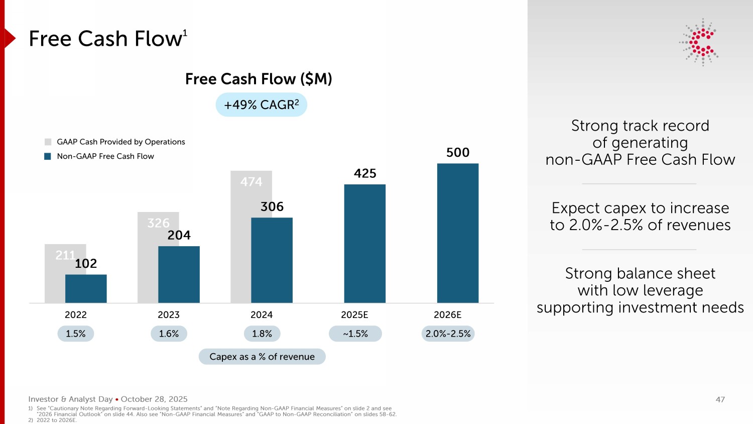 Investor & Analyst Day • October 28, 2025 1.94 2.46 3.88 5.90 8.20 1.46 2.03 3.61 2022 2023 2024 2025E 2026E 7.3 8.0 9.6 12.2 16.0 2022 2023 2024 2025E 2026E 4.9% 5.5% 6.5% 7.4% 7.8% 4.0% 4.2% 6.2% 2022 2023 2024 2025E 2026E 43% CAGR 2 5 year financial progression 1 Accelerating revenue growth and margin expansion driving strong earnings compounding Revenue ($B) Operating Margin EPS Earnings from Operations as a % of Revenue Non - GAAP Adjusted Operating Margin GAAP EPS ($) Non - GAAP Adjusted EPS ($) +290 bps 2 22% CAGR 2 1) See “Cautionary Note Regarding Forward - Looking Statements” and “Note Regarding Non - GAAP Financial Measures” on slide 2 and see “2026 Financial Outlook” on slide 44. Also see “Non - GAAP Financial Measures” and “GAAP to Non - GAAP Reconciliation” on slides 58 - 62. 2) 2022 to 2026E. 46 Investor & Analyst Day • October 28, 2025 ~1.5 % 211 326 474 102 204 306 425 500 2022 2023 2024 2025E 2026E Strong track record of generating non - GAAP Free Cash Flow Expect capex to increase to 2.0% - 2.5% of revenues Strong balance sheet with low leverage supporting investment needs Free Cash Flow 1 Free Cash Flow ($M) +49% CAGR 2 1.5% 2.0 % - 2 .5 % 1.8% 1.6% Capex as a % of revenue GAAP Cash Provided by Operations Non - GAAP Free Cash Flow 1) See “Cautionary Note Regarding Forward - Looking Statements” and “Note Regarding Non - GAAP Financial Measures” on slide 2 and see “2026 Financial Outlook” on slide 44.