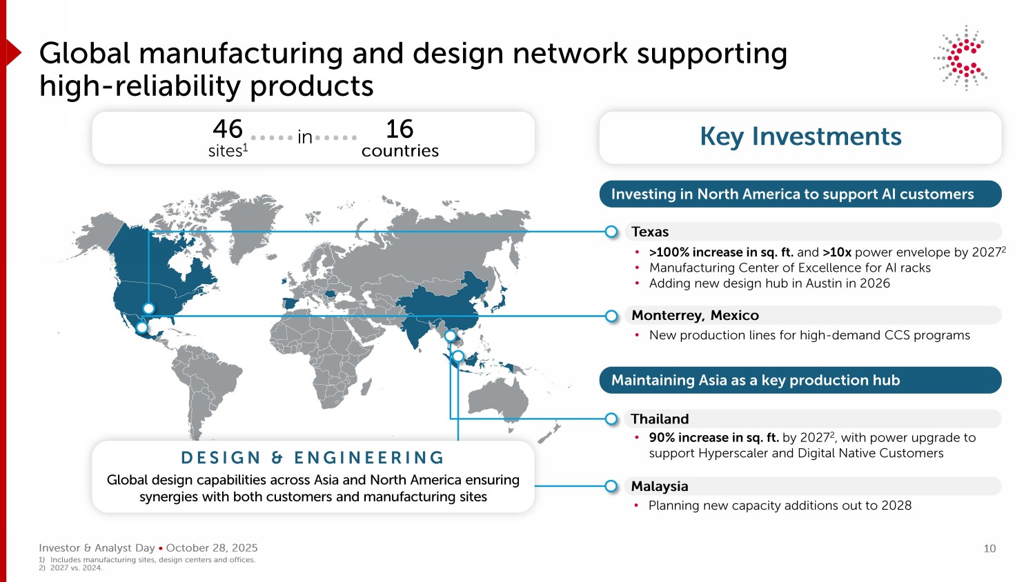8 2021 2018 2019 2020 2022 2023 2024 2025 Investor & Analyst Day • October 28, 2025 7.3 8.0 9.6 12.2 2022 2023 2024 2025E Revenue 4.9% 5.5% 6.5% 7.4% 4.0% 4.2% 6.2% 2022 2023 2024 2025E Consistent execution is driving exceptional financial performance KEY DRIVERS Share Gains & Market Growth Productivity & Efficiency Operating Leverage Favorable Mix Revenue ($B) 1 Operating Margin 1 +250 bps 2 19% CAGR 2 Earnings from Operations as a % of Revenue Non - GAAP Adjusted Operating Margin 1) See “Cautionary Note Regarding Forward - Looking Statements” and “Note Regarding Non - GAAP Financial Measures” on slide 2 and the s ection entitled “Financial Outlook” beginning on slide 43. Also see “Non - GAAP Financial Measures” and “GAAP to Non - GAAP Reconciliation” on slides 58 - 62. 2) 2022 to 2025E. 9 Investor & Analyst Day • October 28, 2025 Key Investments Global manufacturing and design network supporting high - reliability products Investing in North America to support AI customers 46 sites 1 16 countries in • >100% increase in sq.