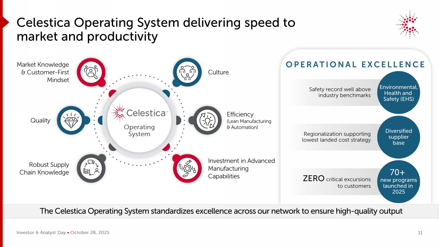 ft. and >10x power envelope by 2027 2 • Manufacturing Center of Excellence for AI racks • Adding new design hub in Austin in 2026 Texas • New production lines for high - demand CCS programs Monterrey, Mexico Maintaining Asia as a key production hub • 90% increase in sq. ft. by 2027 2 , with power upgrade to support Hyperscaler and Digital Native Customers Thailand • Planning new capacity additions out to 2028 Malaysia DESIGN & ENGINEERING Global design capabilities across Asia and North America ensuring synergies with both customers and manufacturing sites 1) Includes manufacturing sites, design centers and offices. 2) 2027 vs. 2024. 10 Investor & Analyst Day • October 28, 2025 OPERATIONAL EXCELLENCE Celestica Operating System delivering speed to market and productivity The Celestica Operating System standardizes excellence across our network to ensure high - quality output Operating System Culture Efficiency (Lean Manufacturing & Automation) Investment in Advanced Manufacturing Capabilities Market Knowledge & Customer - First Mindset Quality Robust Supply Chain Knowledge Safety record well above industry benchmarks Environmental, Health and Safety (EHS) ZERO critical excursions to customers 70+ new programs launched in 2025 Regionalization supporting lowest landed cost strategy Diversified supplier base 11