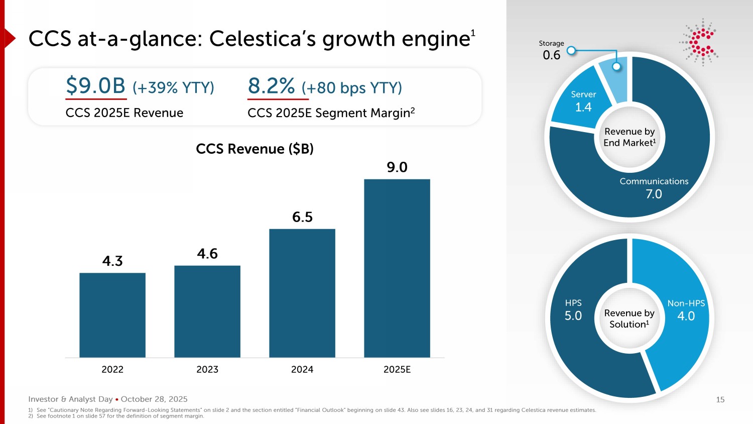 2025 INVESTOR & ANALYST DAY Connectivity & Cloud Solutions Jason Phillips President, CCS Investor & Analyst Day • October 28, 2025 Non - HPS 4.0 HPS 5.0 Revenue by Solution 1 CCS at - a - glance: Celestica’s growth engine 1 $9.0B (+39% YTY) CCS 2025E Revenue 8.2% (+80 bps YTY) CCS 2025E Segment Margin 2 4.3 4.6 6.5 9.0 2022 2023 2024 2025E Communications 7.0 Server 1.4 Storage 0.6 Revenue by End Market 1 CCS Revenue ($B) 1) See “Cautionary Note Regarding Forward - Looking Statements” on slide 2 and the section entitled “Financial Outlook” beginning on slide 43. Also see slides 16, 23, 24, and 31 regarding Celestica revenue estimates. 2) See footnote 1 on slide 57 for the definition of segment margin. 15 Investor & Analyst Day • October 28, 2025 1.8 1.7 2.8 5.0 2022 2023 2024 2025E Growing investments to support our platform solutions $5.0B (+80% YTY) HPS 2025E Revenue 1 1,100+ design engineers $46 $61 $78 $120 HPS Revenue ($B) HPS Revenue and R&D Investment 1 7 global design sites 50%+ growth in R&D investment expected in 2026E R&D Investment ($M) 1) See “Cautionary Note Regarding Forward - Looking Statements” on slide 2 and the section entitled “Financial Outlook” beginning on slide 43.