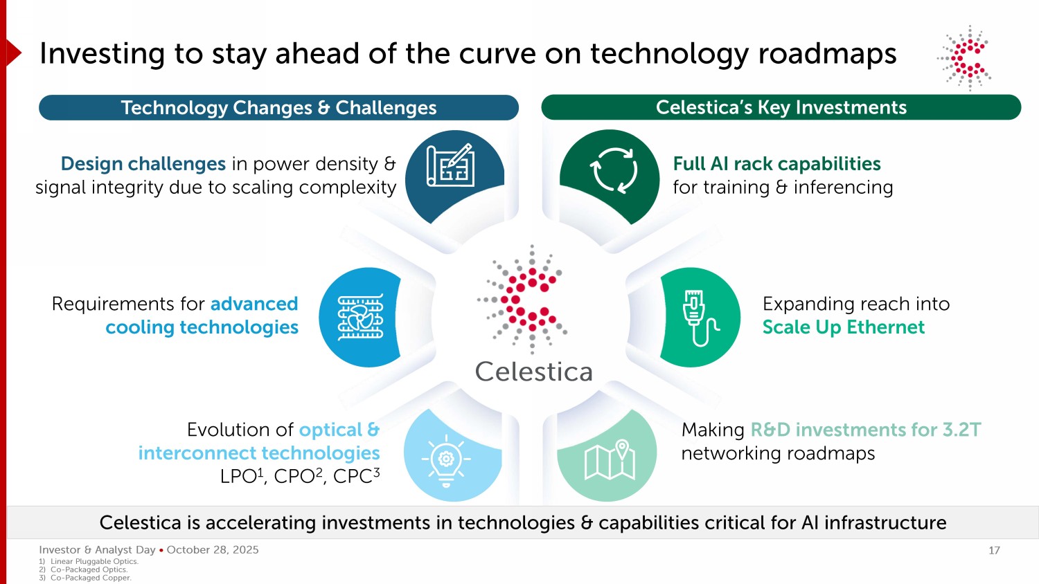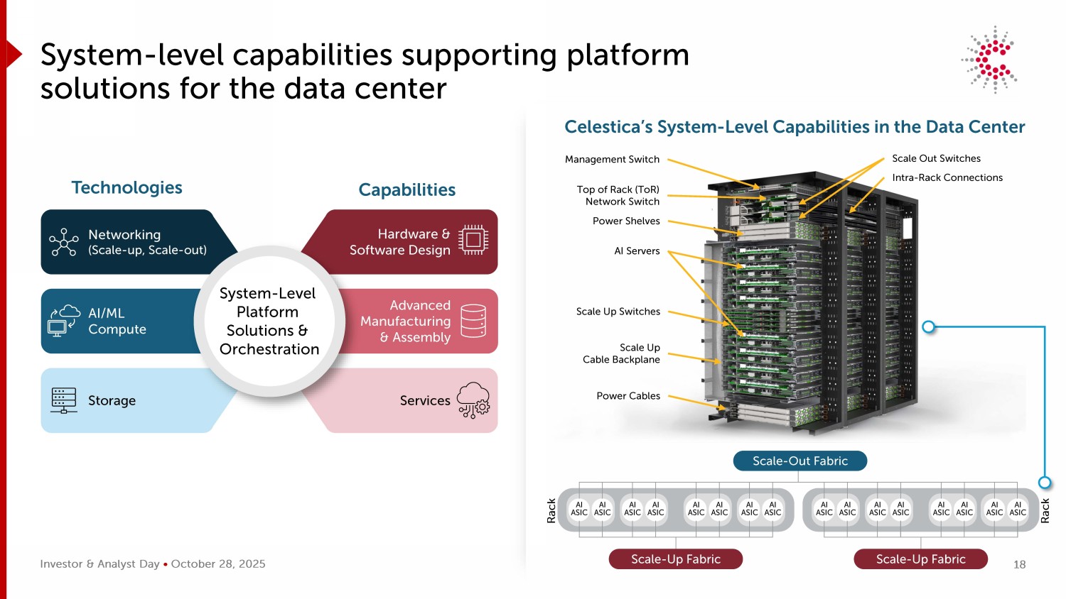 Investor & Analyst Day • October 28, 2025 Investing to stay ahead of the curve on technology roadmaps Celestica Design challenges in power density & signal integrity due to scaling complexity Evolution of optical & interconnect technologies LPO 1 , CPO 2 , CPC 3 Requirements for advanced cooling technologies Full AI rack capabilities for training & inferencing Expanding reach into Scale Up Ethernet Making R&D investments for 3.2T networking roadmaps Celestica is accelerating investments in technologies & capabilities critical for AI infrastructure Technology Changes & Challenges Celestica’s Key Investments 1) Linear Pluggable Optics. 2) Co - Packaged Optics. 3) Co - Packaged Copper. 17 Investor & Analyst Day • October 28, 2025 Scale Up Cable Backplane Management Switch Top of Rack ( ToR ) Network Switch Scale Out Switches Power Shelves Intra - Rack Connections AI Servers Scale Up Switches Power Cables System - level capabilities supporting platform solutions for the data center Celestica’s System - Level Capabilities in the Data Center Advanced Manufacturing & Assembly AI/ML Compute Services Storage Hardware & Software Design Networking (Scale - up, Scale - out) System - Level Platform Solutions & Orchestration Technologies Capabilities AI ASIC AI ASIC AI ASIC AI ASIC AI ASIC AI ASIC AI ASIC AI ASIC AI ASIC AI ASIC AI ASIC AI ASIC AI ASIC AI ASIC AI ASIC AI ASIC Scale - Out Fabric Scale - Up Fabric Scale - Up Fabric Rack Rack 18