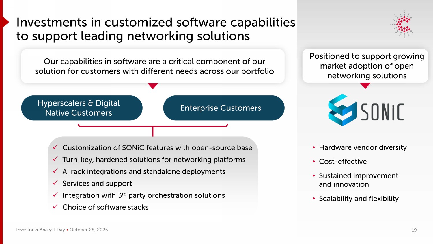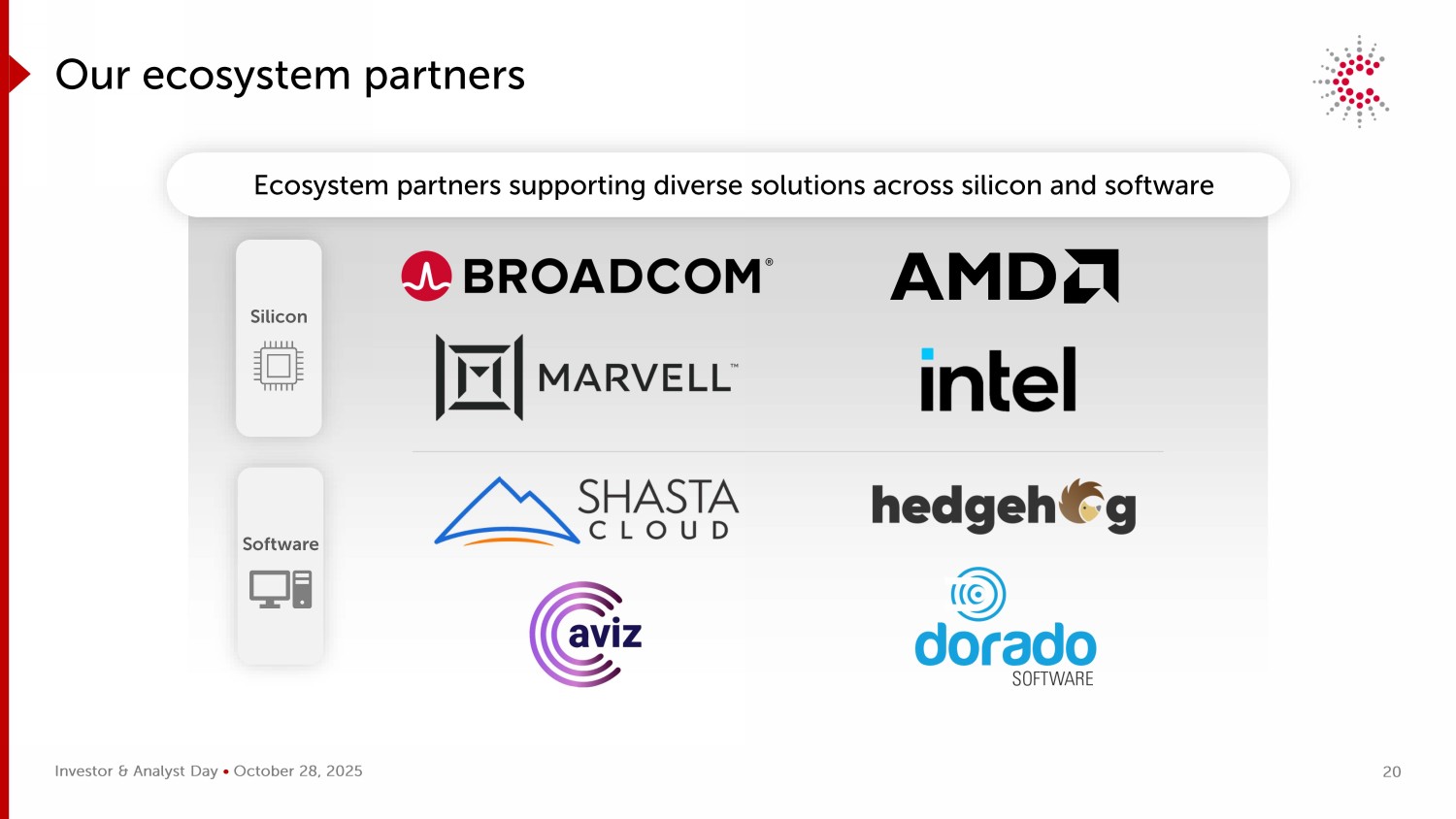 Investor & Analyst Day • October 28, 2025 Enterprise Customers Investments in customized software capabilities to support leading networking solutions Our capabilities in software are a critical component of our solution for customers with different needs across our portfolio • Hardware vendor diversity • Cost - effective • Sustained improvement and innovation • Scalability and flexibility Hyperscalers & Digital Native Customers Positioned to support growing market adoption of open networking solutions x Customization of SONiC features with open - source base x Turn - key, hardened solutions for networking platforms x AI rack integrations and standalone deployments x Services and support x Integration with 3 rd party orchestration solutions x Choice of software stacks 19 Investor & Analyst Day • October 28, 2025 Our ecosystem partners Silicon Software Ecosystem partners supporting diverse solutions across silicon and software 20
