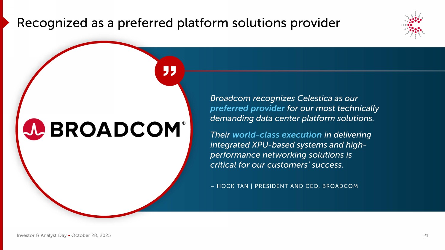 Investor & Analyst Day • October 28, 2025 Recognized as a preferred platform solutions provider 21 Broadcom recognizes Celestica as our preferred provider for our most technically demanding data center platform solutions. Their world - class execution in delivering integrated XPU - based systems and high - performance networking solutions is critical for our customers’ success.
