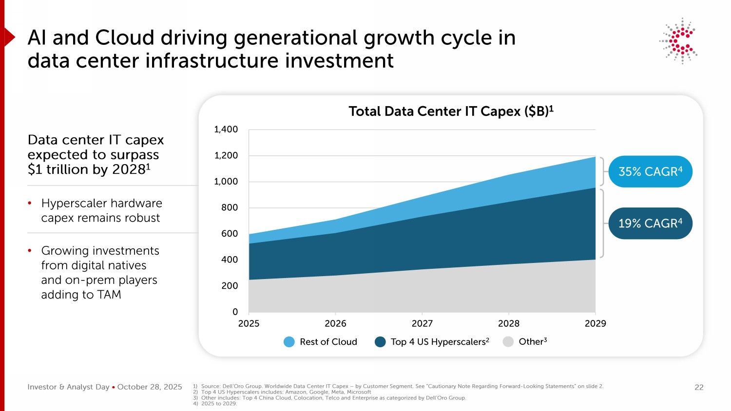 – HOCK TAN | PRESIDENT AND CEO, BROADCOM Investor & Analyst Day • October 28, 2025 0 200 400 600 800 1,000 1,200 1,400 2025 2026 2027 2028 2029 AI and Cloud driving generational growth cycle in data center infrastructure investment Data center IT capex expected to surpass $1 trillion by 2028 1 • Hyperscaler hardware capex remains robust • Growing investments from digital natives and on - prem players adding to TAM Total Data Center IT Capex ($B) 1 35 % CAGR 4 Top 4 US Hyperscalers 2 Rest of Cloud Other 3 19 % CAGR 4 1) Source: Dell’Oro Group. Worldwide Data Center IT Capex – by Customer Segment. See “Cautionary Note Regarding Forward - Looking Statements” on slid e 2. 2) Top 4 US Hyperscalers includes: Amazon, Google, Meta, Microsoft 3) Other includes: Top 4 China Cloud, Colocation, Telco and Enterprise as categorized by Dell’Oro Group. 4) 2025 to 2029. 22 Investor & Analyst Day • October 28, 2025 Hyperscaler portfolio demand remains strong in the near to medium - term Outlook supported by program awards with ramps beginning in 2027 Digital Native Customer portfolio expected to ramp meaningfully in 2027 51% 62% 74% 77% 4.3 4.6 6.5 9.0 2022 2023 2024 2025E Growing exposure to the leading data center companies 1 CCS Revenue by Customer ($B) 1 Hyperscalers OEM and other customers 1) See “Cautionary Note Regarding Forward - Looking Statements” on slide 2 and the section entitled “Financial Outlook” beginning on slide 43.