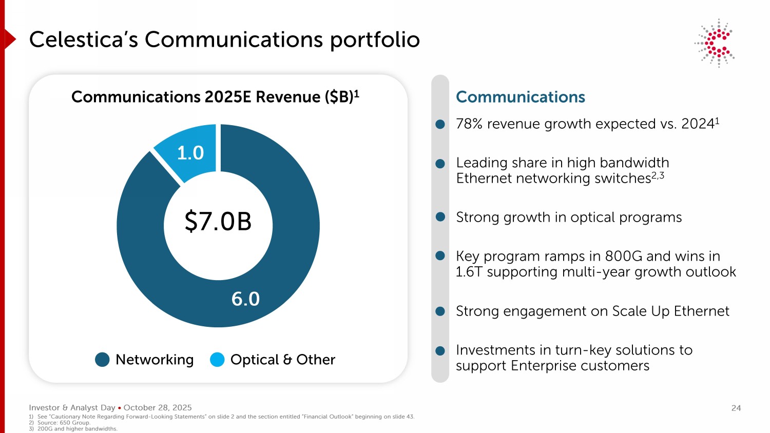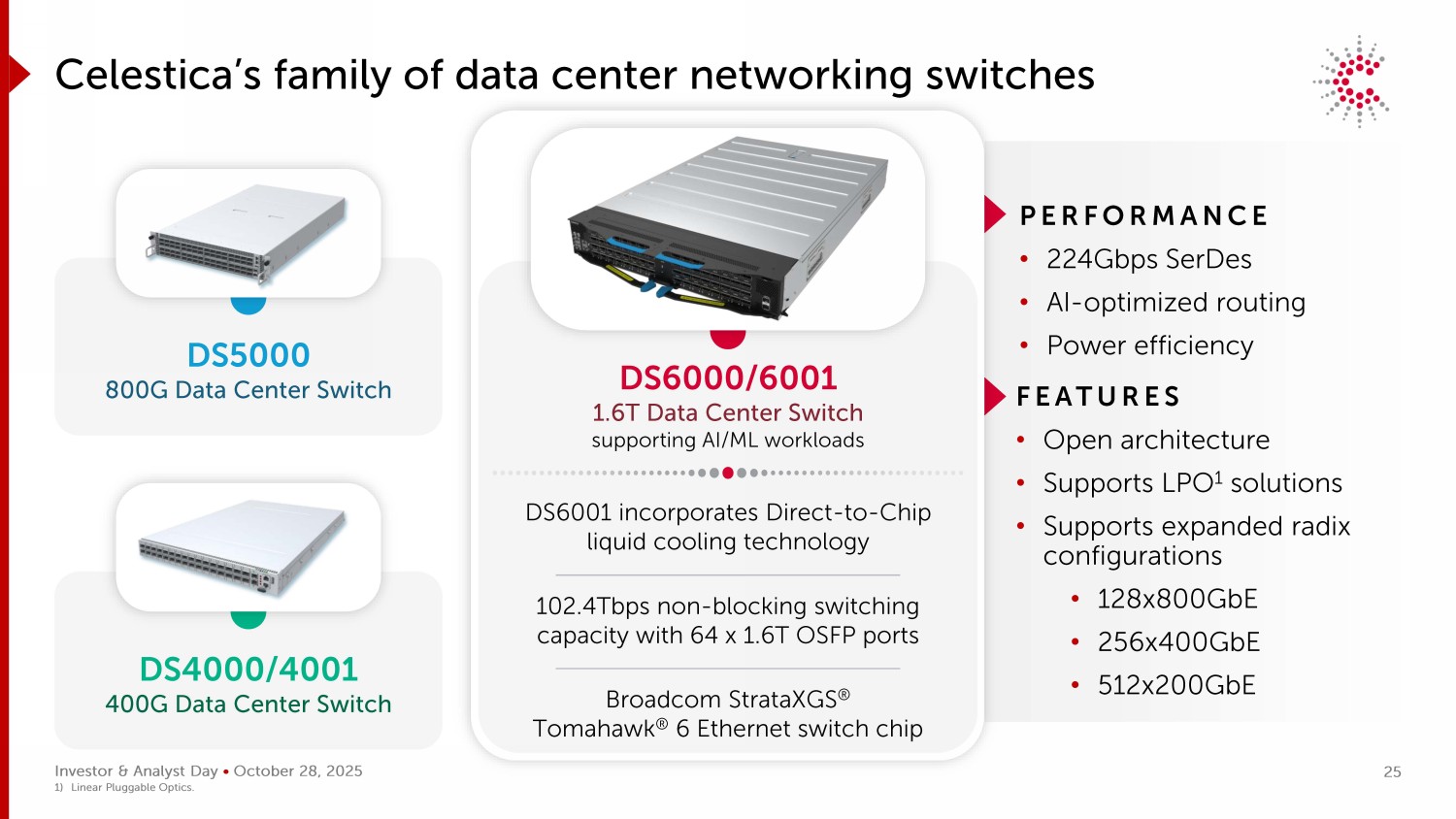 Investor & Analyst Day • October 28, 2025 6.0 1.0 Celestica’s Communications portfolio Communications 2025E Revenue ($B) 1 Networking Optical & Other $7 .0 B Leading share in high bandwidth Ethernet networking switches 2,3 Key program ramps in 800G and wins in 1.6T supporting multi - year growth outlook Strong engagement on Scale Up Ethernet Strong growth in optical programs Investments in turn - key solutions to support Enterprise customers 78% revenue growth expected vs. 2024 1 Communications 1) See “Cautionary Note Regarding Forward - Looking Statements” on slide 2 and the section entitled “Financial Outlook” beginning on slide 43. 2) Source: 650 Group. 3) 200G and higher bandwidths. 24 Investor & Analyst Day • October 28, 2025 FEATURES • Open architecture • Supports LPO 1 solutions • Supports expanded radix configurations • 128x800GbE • 256x400GbE • 512x200GbE PERFORMANCE • 224Gbps SerDes • AI - optimized routing • Power efficiency DS6000/6001 1.6T Data Center Switch supporting AI/ML workloads Celestica’s family of data center networking switches DS5000 800G Data Center Switch DS4000/4001 4 00G Data Center Switch DS6001 incorporates Direct - to - Chip liquid cooling technology 102.4Tbps non - blocking switching capacity with 64 x 1.6T OSFP ports Broadcom StrataXGS ® Tomahawk ® 6 Ethernet switch chip 1) Linear Pluggable Optics.
