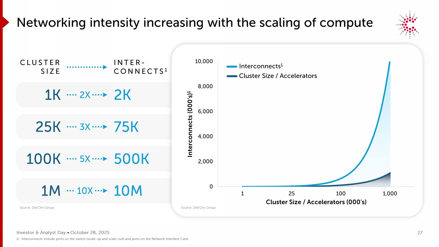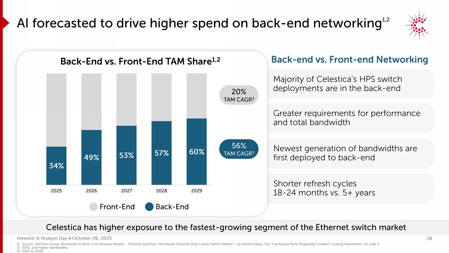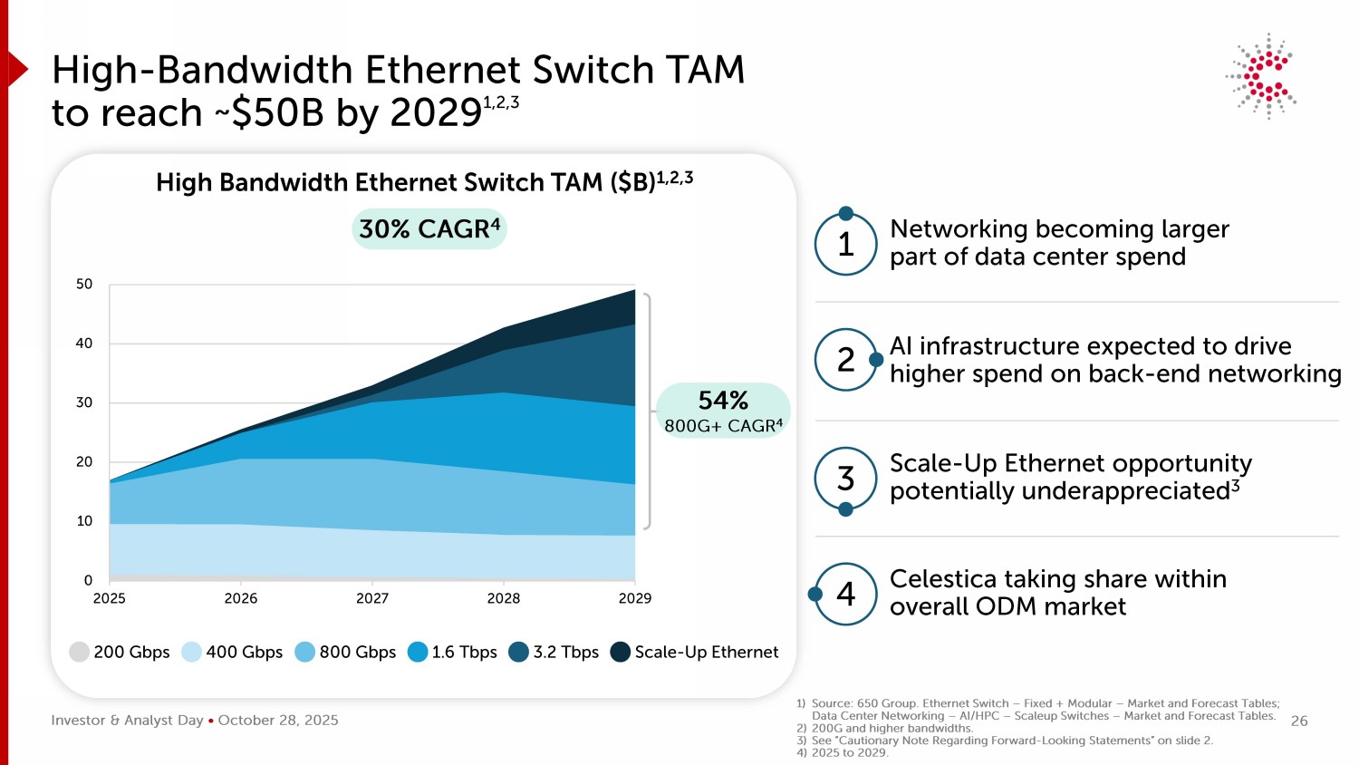 Investor & Analyst Day • October 28, 2025 0 10 20 30 40 50 2025 2026 2027 2028 2029 High - Bandwidth Ethernet Switch TAM to reach ~ $50B by 2029 1,2,3 High Bandwidth Ethernet Switch TAM ($B) 1,2,3 1 Networking becoming larger part of data center spend 2 AI infrastructure expected to drive higher spend on back - end networking 3 Scale - Up Ethernet opportunity potentially underappreciated 3 4 Celestica taking share within overall ODM market 30% CAGR 4 54 % 800G+ CAGR 4 400 Gbps 800 Gbps 1.6 Tbps 3.2 Tbps Scale - Up Ethernet 200 Gbps 1) Source: 650 Group. Ethernet Switch – Fixed + Modular – Market and Forecast Tables; Data Center Networking – AI/HPC – Scaleup Switches – Market and Forecast Tables. 2) 200G and higher bandwidths. 3) See “Cautionary Note Regarding Forward - Looking Statements” on slide 2. 4) 2025 to 2029. 26 Investor & Analyst Day • October 28, 2025 Networking intensity increasing with the scaling of compute CLUSTER SIZE INTER - CONNECTS 1 1K 2K 25K 75K 100K 500K 2X 3X 5X 10X 1M 10M 0 2,000 4,000 6,000 8,000 10,000 1 25 100 1,000 Interconnects (000’s) 1 Cluster Size / Accelerators (000's) Interconnects 1 Cluster Size / Accelerators 1) Interconnects include ports on the switch (scale - up and scale - out) and ports on the Network Interface Card.