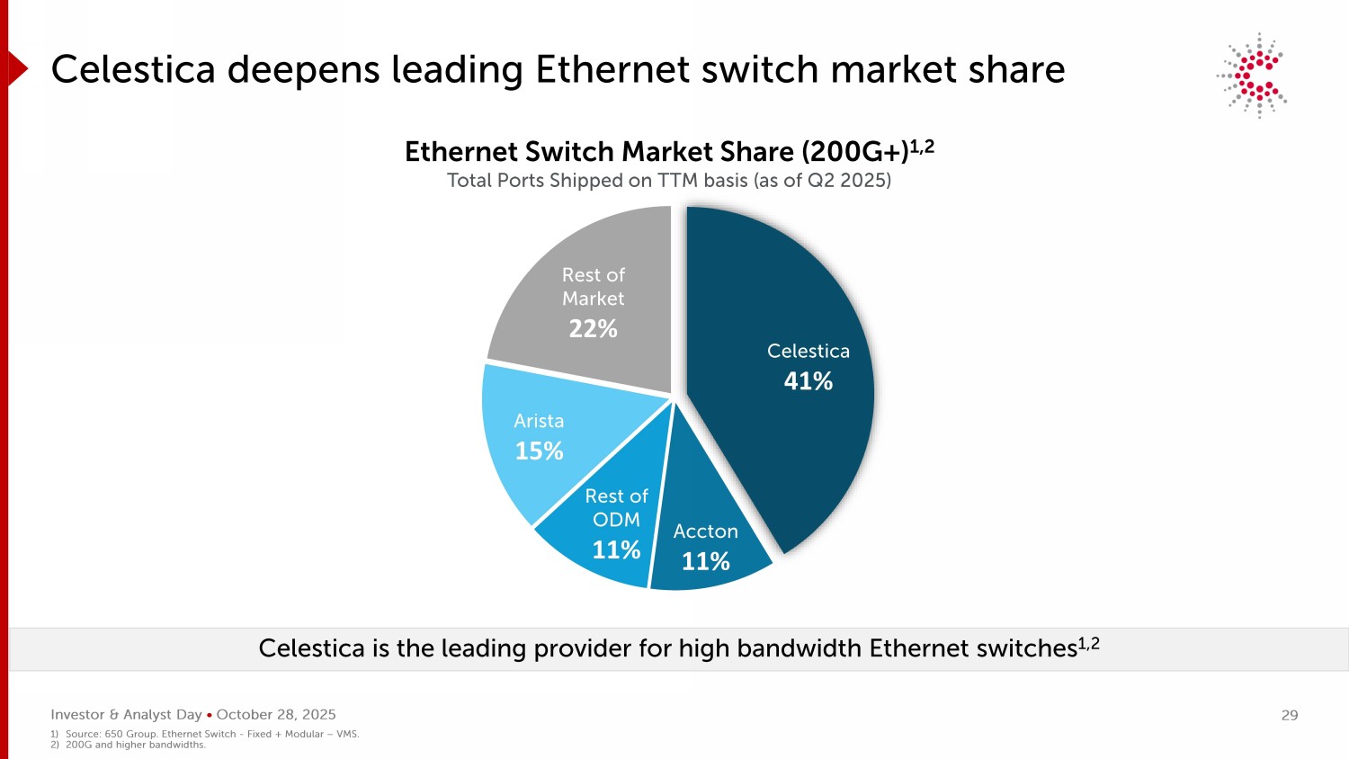 Investor & Analyst Day • October 28, 2025 34% 49% 53% 57% 60% 2025 2026 2027 2028 2029 Back - End vs. Front - End TAM Share 1,2 AI forecasted to drive higher spend on back - end networking 1,2 Front - End Back - End Greater requirements for performance and total bandwidth Majority of Celestica’s HPS switch deployments are in the back - end Newest generation of bandwidths are first deployed to back - end 56% TAM CAGR 3 20% TAM CAGR 3 Celestica has higher exposure to the fastest - growing segment of the Ethernet switch market Shorter refresh cycles 18 - 24 months vs. 5+ years Back - end vs. Front - end Networking 1) Source: Dell’Oro Group. Worldwide AI Back - End Network Market – Ethernet Switches; Worldwide Ethernet Data Center Switch Market – by Speed (Gbps) . See “Cautionary Note Regarding Forward - Looking Statements” on slide 2. 2) 200G and higher bandwidths. 3) 2025 to 2029. 28 Investor & Analyst Day • October 28, 2025 Celestica deepens leading Ethernet switch market share Celestica is the leading provider for high bandwidth Ethernet switches 1,2 Celestica 41% Accton 11% Rest of ODM 11% Arista 15% Rest of Market 22% Ethernet Switch Market Share (200G+) 1,2 Total Ports Shipped on TTM basis (as of Q2 2025) 1) Source: 650 Group.