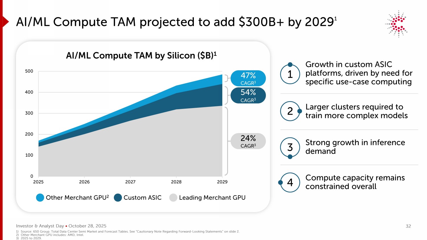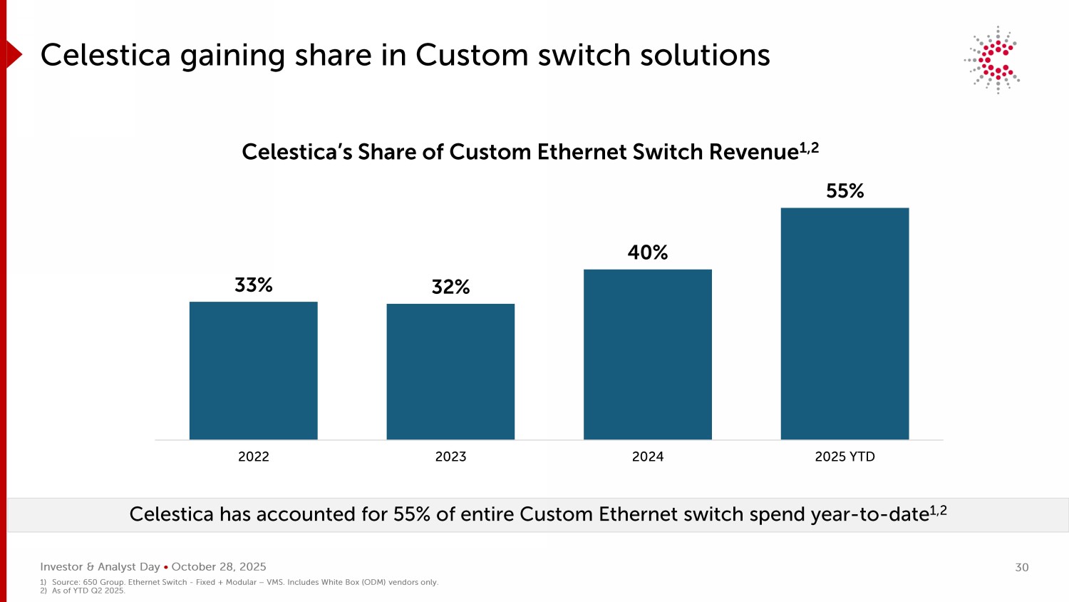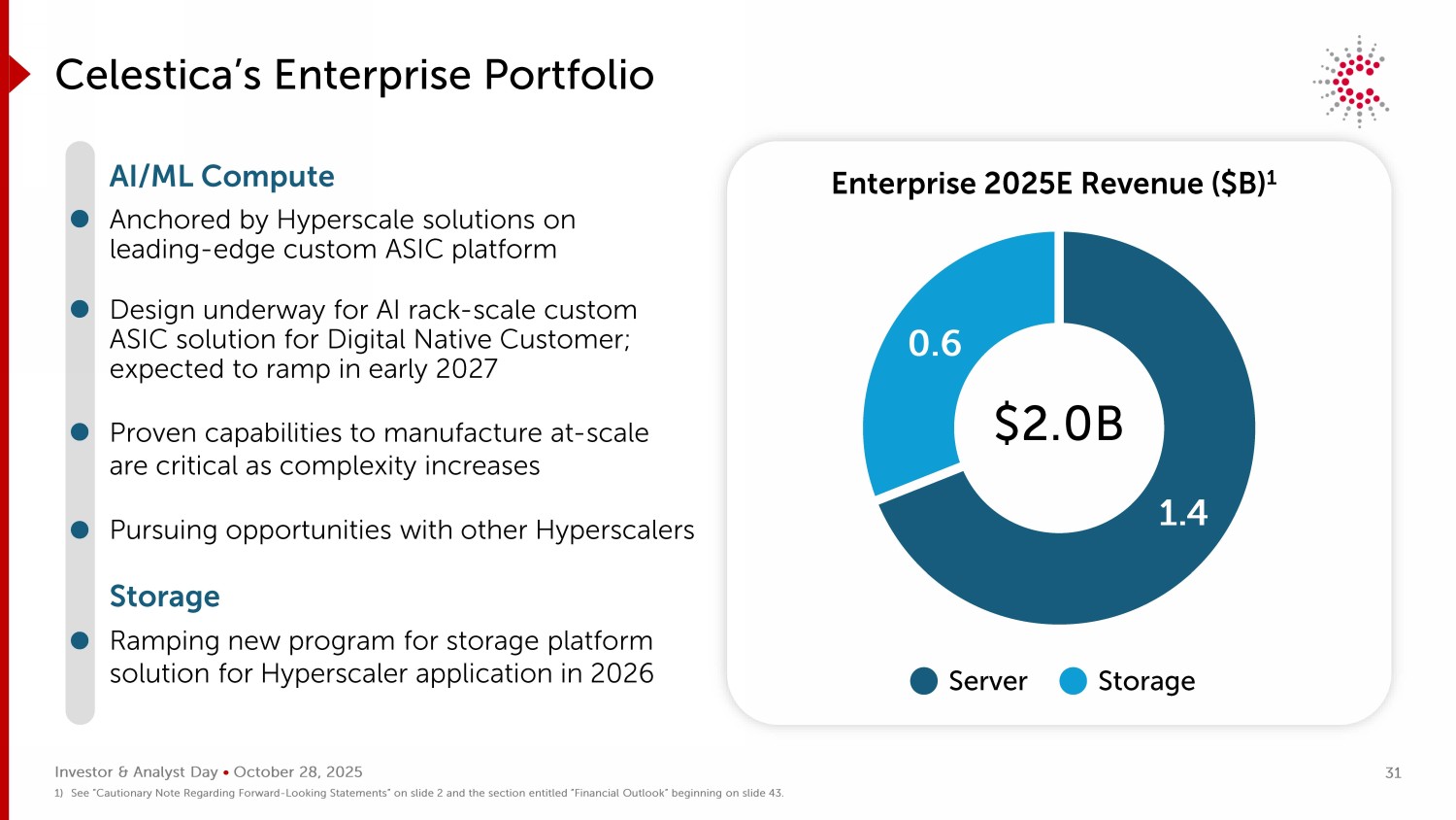 Investor & Analyst Day • October 28, 2025 Celestica gaining share in Custom switch solutions Celestica has accounted for 55% of entire Custom Ethernet switch spend year - to - date 1,2 Celestica’s Share of Custom Ethernet Switch Revenue 1,2 33% 32% 40% 55% 2022 2023 2024 2025 YTD 1) Source: 650 Group. Ethernet Switch - Fixed + Modular – VMS. Includes White Box (ODM) vendors only. 2) As of YTD Q2 2025. 30 Investor & Analyst Day • October 28, 2025 1.4 0.6 Celestica’s Enterprise Portfolio Anchored by Hyperscale solutions on leading - edge custom ASIC platform Design underway for AI rack - scale custom ASIC solution for Digital Native Customer; expected to ramp in early 2027 Pursuing opportunities with other Hyperscalers Proven capabilities to manufacture at - scale are critical as complexity increases $2.0B Enterprise 2025E Revenue ($B) 1 Server Storage Ramping new program for storage platform solution for Hyperscaler application in 2026 AI/ML Compute Storage 1) See “Cautionary Note Regarding Forward - Looking Statements” on slide 2 and the section entitled “Financial Outlook” beginning on slide 43. 31 Investor & Analyst Day • October 28, 2025 0 100 200 300 400 500 2025 2026 2027 2028 2029 AI/ML Compute TAM projected to add $300B+ by 2029 1 AI/ML Compute TAM by Silicon ($B) 1 1 Growth in custom ASIC platforms, driven by need for specific use - case computing 2 Larger clusters required to train more complex models 3 Strong growth in inference demand 4 Compute capacity remains constrained overall Other Merchant GPU 2 Custom ASIC Leading Merchant GPU 54% CAGR 3 24% CAGR 3 1) Source: 650 Group.