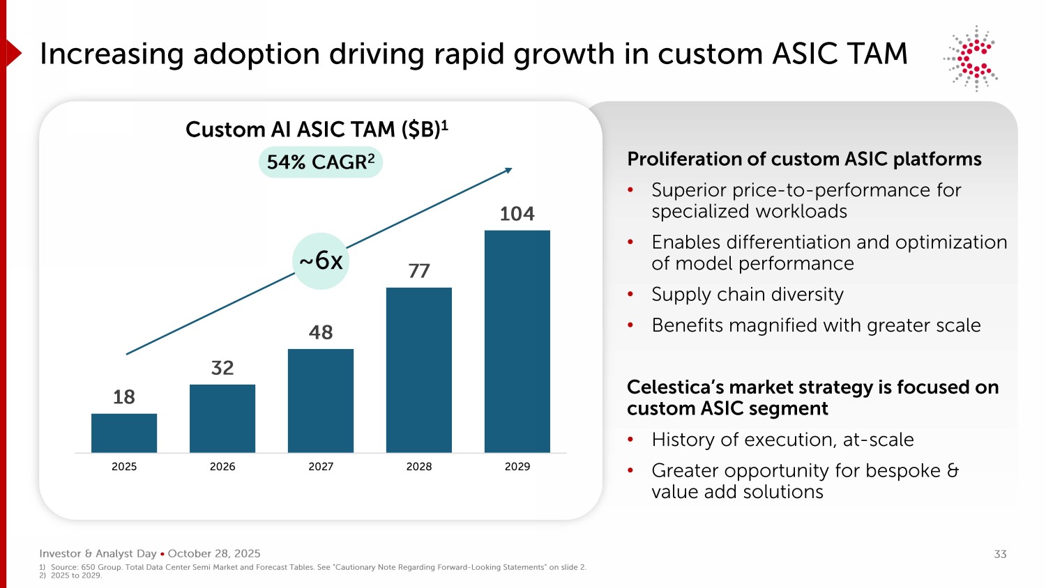 47% CAGR 3 32 Investor & Analyst Day • October 28, 2025 Increasing adoption driving rapid growth in custom ASIC TAM Proliferation of custom ASIC platforms • Superior price - to - performance for specialized workloads • Enables differentiation and optimization of model performance • Supply chain diversity • Benefits magnified with greater scale Celestica’s market strategy is focused on custom ASIC segment • History of execution, at - scale • Greater opportunity for bespoke & value add solutions Custom AI ASIC TAM ($B) 1 18 32 48 77 104 2025 2026 2027 2028 2029 54% CAGR 2 ~6x 1) Source: 650 Group. Total Data Center Semi Market and Forecast Tables. See “Cautionary Note Regarding Forward - Looking Statements” on slide 2. 2) 2025 to 2029. 33 Investor & Analyst Day • October 28, 2025 Leading market share in high - bandwidth Ethernet switching 1,2 Market Leadership Deeply entrenched relationships with the industry’s largest customers and ecosystem partners Key Relationships Multi - year runway for growth in AI investments Data center customers are fully committed to large scale investments in AI infrastructure CCS key takeaways AI Investments Networking 800G in ’25/’26 1.6T in ‘26/’27 AI/ML Compute Next - gen custom ASIC platforms Exposure to Upgrade Cycles More engagement on systems - level solutions Solutions becoming more bespoke Higher - Complexity Solutions 1) Source: 650 Group.