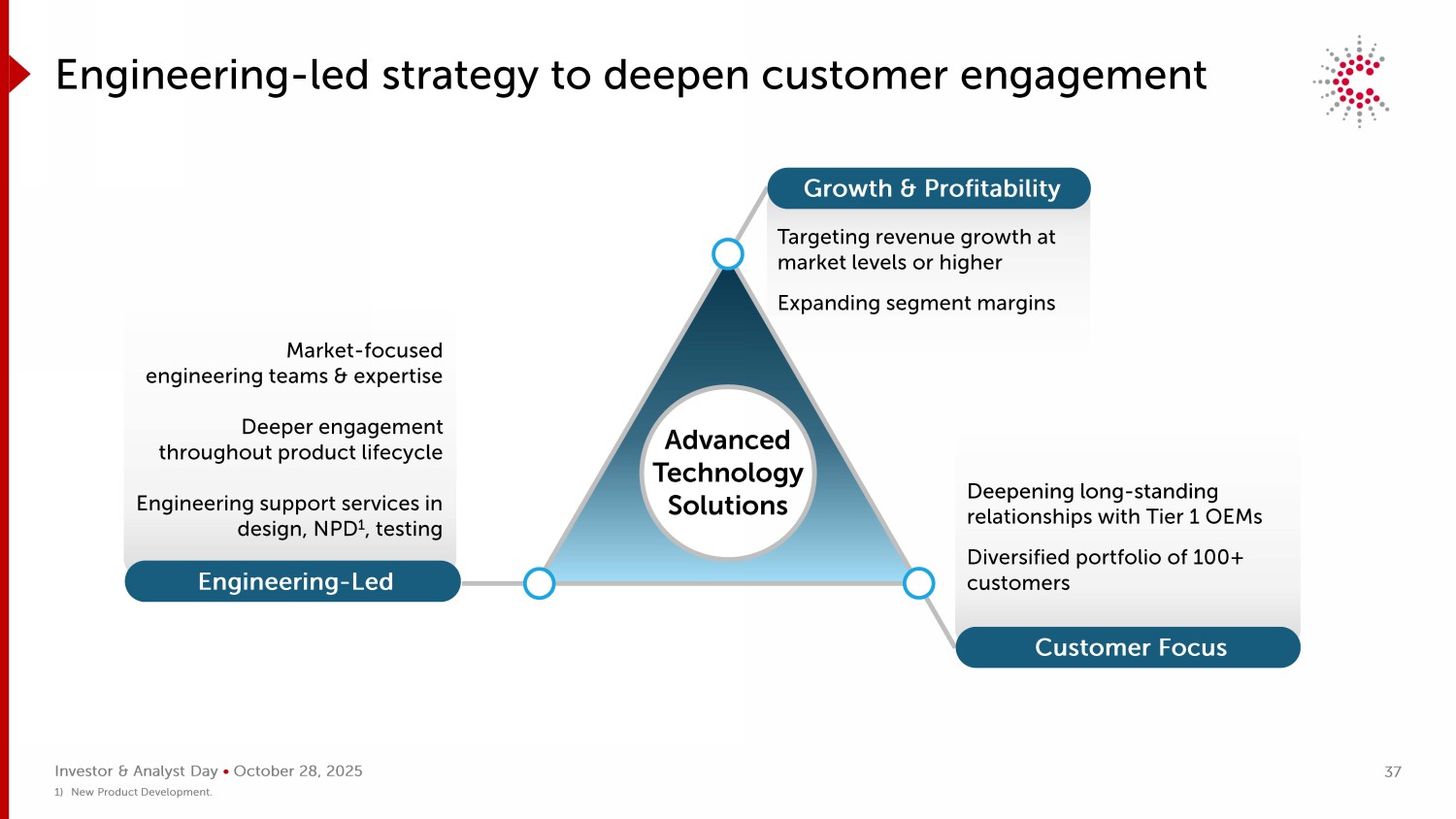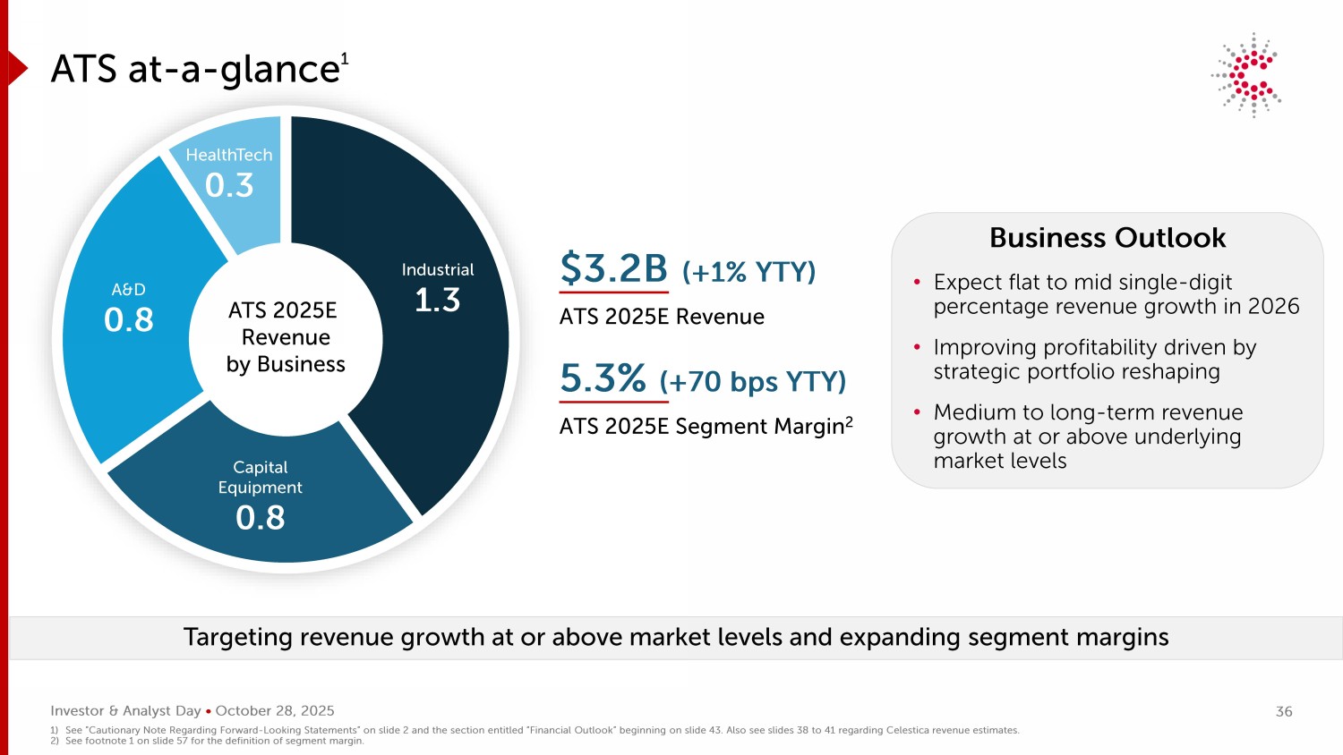 2025 INVESTOR & ANALYST DAY Advanced Technology Solutions Todd Cooper President, ATS Investor & Analyst Day • October 28, 2025 ATS at - a - glance 1 Targeting revenue growth at or above market levels and expanding segment margins Industrial 1.3 Capital Equipment 0.8 A&D 0.8 HealthTech 0.3 ATS 2025E Revenue by Business $3.2B (+1% YTY) ATS 2025E Revenue 5.3% (+70 bps YTY) ATS 2025E Segment Margin 2 Business Outlook • Expect flat to mid single - digit percentage revenue growth in 2026 • Improving profitability driven by strategic portfolio reshaping • Medium to long - term revenue growth at or above underlying market levels 1) See “Cautionary Note Regarding Forward - Looking Statements” on slide 2 and the section entitled “Financial Outlook” beginning on slide 43. Also see slides 38 to 41 regarding Celestica revenue estimates. 2) See footnote 1 on slide 57 for the definition of segment margin. 36 Investor & Analyst Day • October 28, 2025 Targeting revenue growth at market levels or higher Expanding segment margins Deepening long - standing relationships with Tier 1 OEMs Diversified portfolio of 100+ customers Market - focused engineering teams & expertise Deeper engagement throughout product lifecycle Engineering support services in design, NPD 1 , testing Engineering - led strategy to deepen customer engagement Customer Focus Engineering - Led Growth & Profitability Advanced Technology Solutions 1) New Product Development.